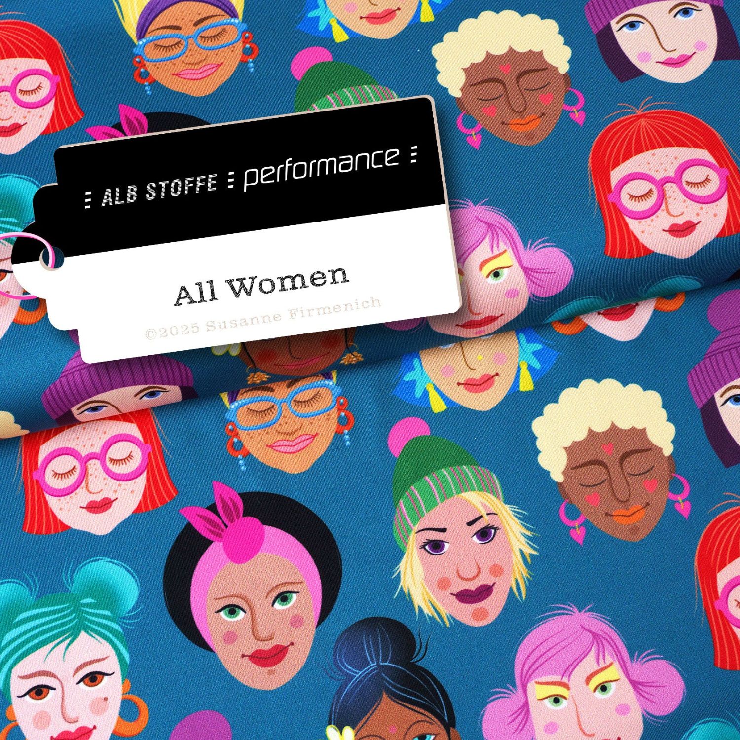 De "All Woman Petrol" uit de Albstoffe Performance collectie is een echt statement piece voor iedereen die van actieve mode houdt. Gestileerde vrouwenfiguren in heldere lijnen ontvouwen zich op rijke benzine - zelfverzekerd, modern en vol beweging. De silhouetten zien eruit als kleine illustraties: soms in sportieve poses, soms ontspannen, maar altijd krachtig en vrouwelijk. Subtiele contrasterende kleuren plaatsen accenten zonder de rustige, elegante basistoon te verstoren.
