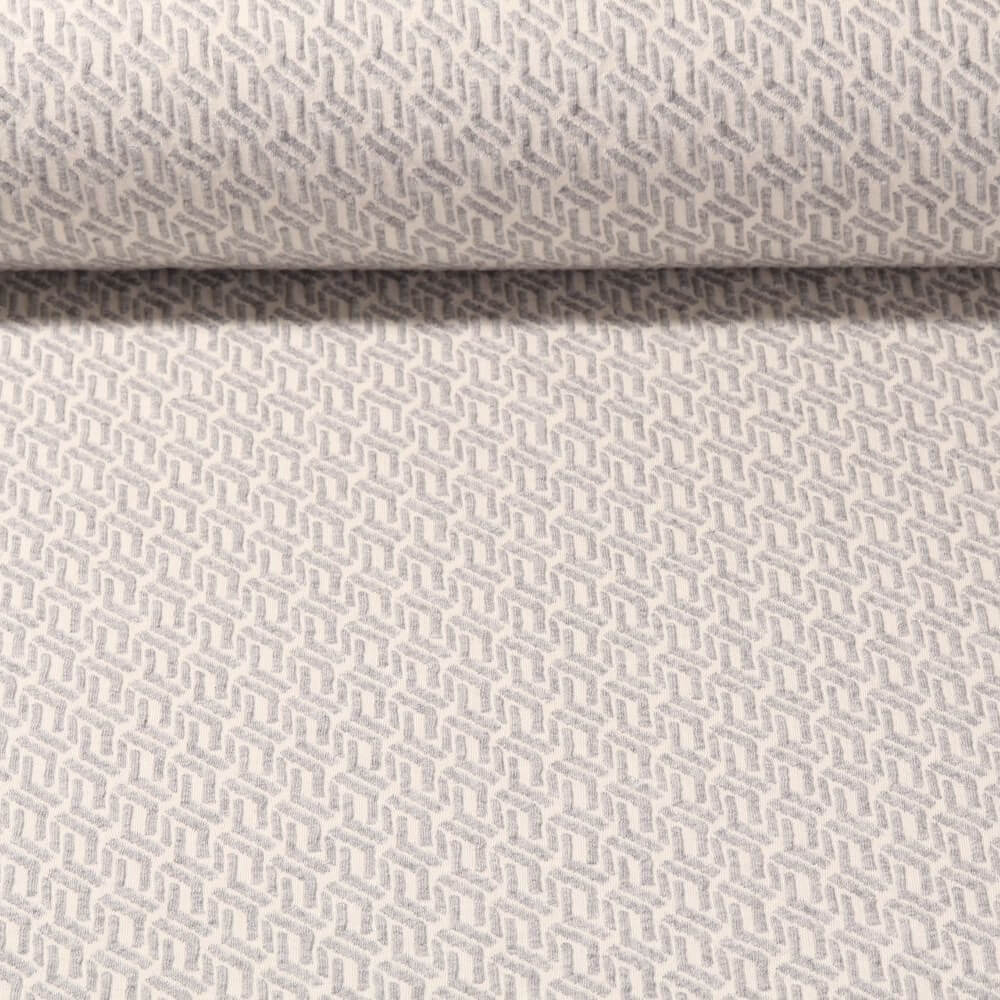 Deze speciale jersey uit de "Queens United" collectie combineert een gebreide look en een opvallend ontwerp in één stof. Een grafisch patroon dat doet denken aan gebreide steken loopt over een zachte, lichtgrijze achtergrond in harmonieus op elkaar afgestemde kleuren: delicate roze en bessentinten ontmoeten warm mosterdgeel, gedempt blauw en subtiele accenten in zwart en wit.