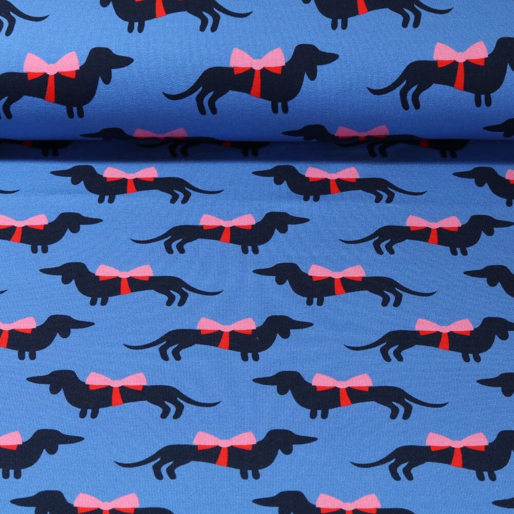 Hier komt de ultieme feel-good stof voor alle teckelfans! Vrolijke Wienerhonden in stijlvolle outfits ravotten rond op een sterke, rijke blauwe achtergrond - met zonnebril, hoed, sjaal en heel veel persoonlijkheid. Speelse details en kleine grafische elementen in de typische stijl zorgen voor het extra bling-bling effect zonder te overdadig over te komen.