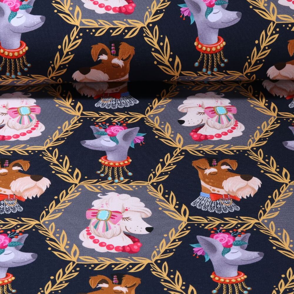 Hier komt de perfecte stof voor alle hondenfans met gevoel voor stijl! Vrolijke honden in allerlei rassen en kleuren flaneren op een diep marineblauwe achtergrond - van kleine poezen tot coole viervoeters met zonnebrillen. Kleine sterren, stippen en speelse details flitsen ertussenuit en geven het ontwerp zijn "bling bling" charme.