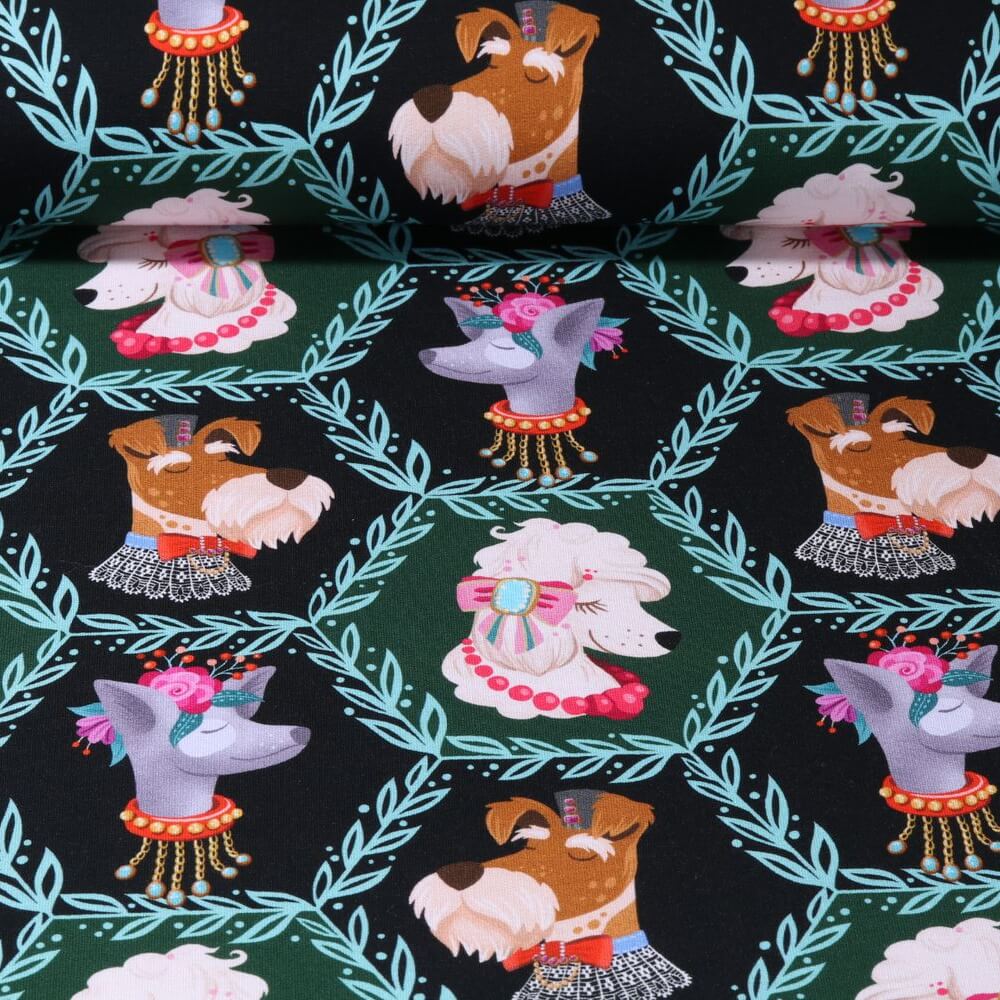 Een stof om verliefd op te worden - brutaal, speels en gewoonweg schattig! Vrolijke honden in stijlvolle outfits flaneren op een diepzwarte achtergrond: van coole viervoeters met zonnebrillen tot schattige pluizige honden met strikjes. Kleine sterren, stippen en grafische elementen schitteren tussendoor - perfect voor iedereen die van kleurrijk en ongewoon houdt.