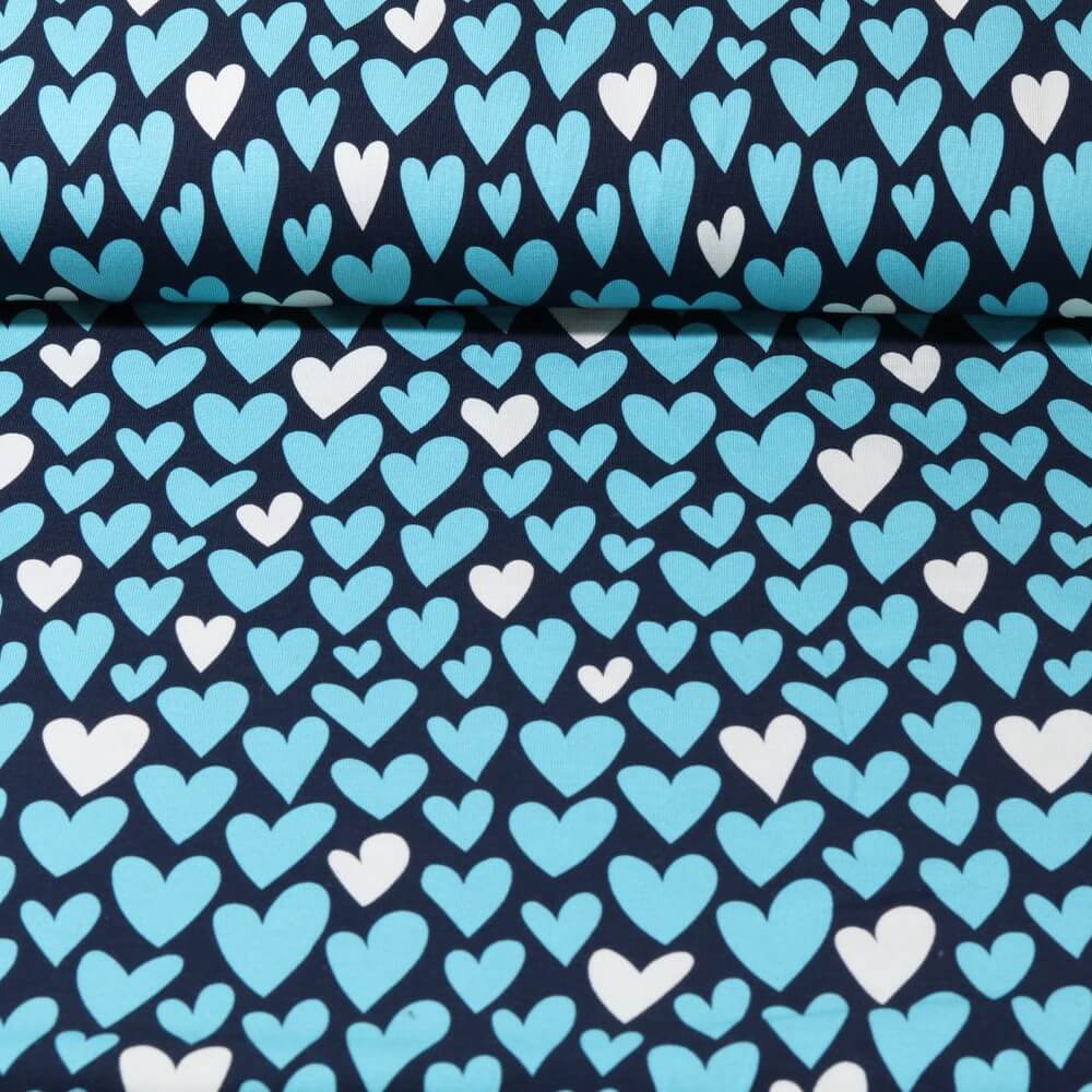 Een stof om verliefd op te worden: Kleine, gestileerde handen die liefdevol een hart vormen schitteren op een diep marineblauwe achtergrond - een modern, grafisch ontwerp met veel gevoel. Warme rood- en roze tinten, delicate beige nuances en fijne lijnen in frisse accentkleuren steken duidelijk af tegen de donkere achtergrond en brengen het patroon tot leven zonder het onrustig te laten lijken.