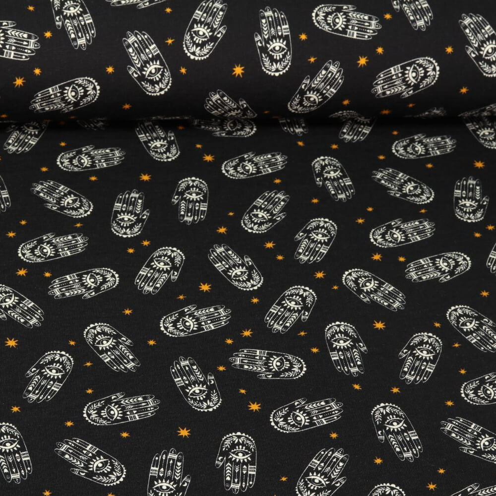 Een stof als een beschermende spreuk: delicate, licht glinsterende beschermende symbolen - van gestileerde ogen en kleine sterren tot fijne ornamenten - schitteren op een diepzwarte achtergrond. De delicate lijnen in lichte pasteltinten en een subtiel goudeffect zien eruit als glinsterende lichtpuntjes in het donker en geven het ontwerp een mysterieuze maar zeer moderne uitstraling.