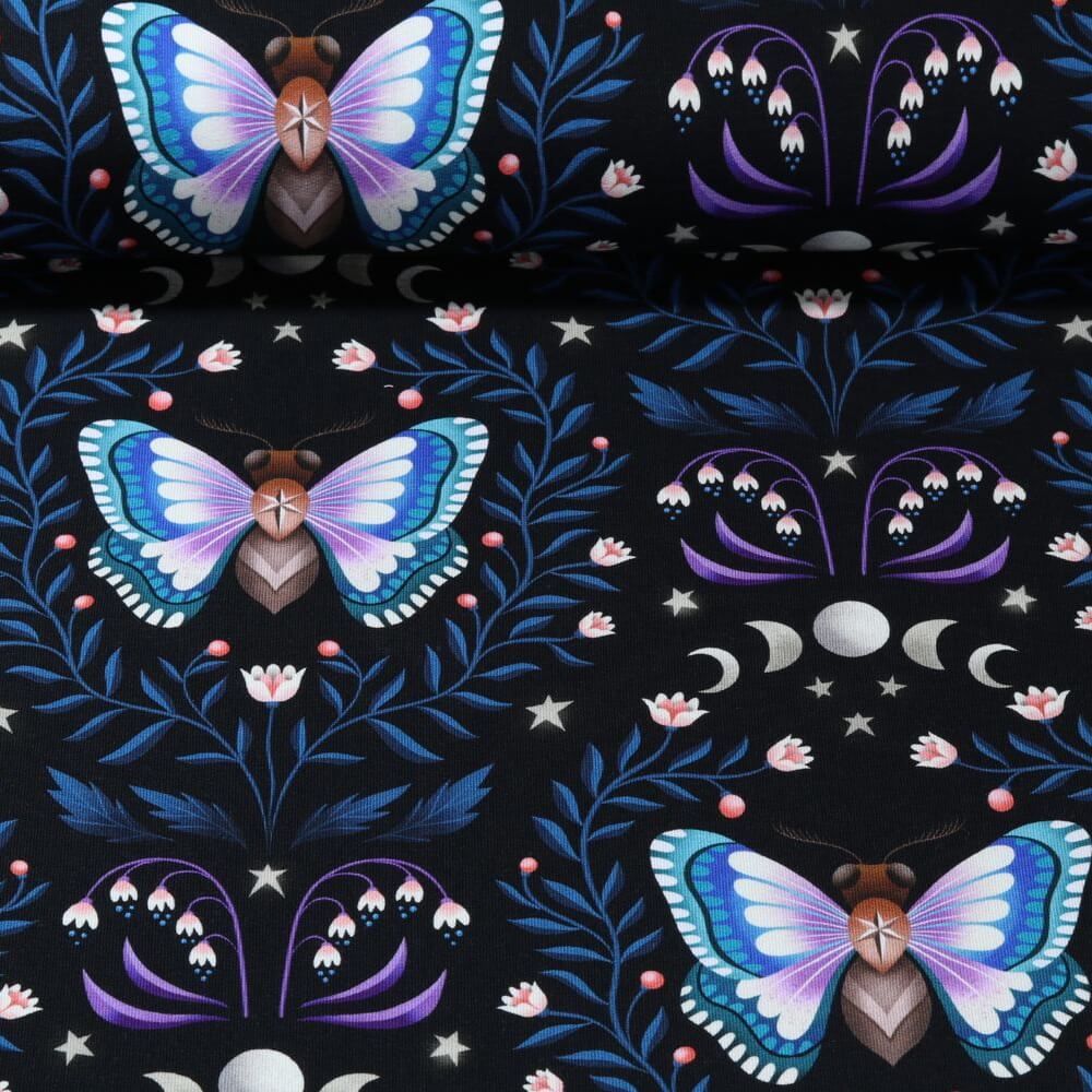 Een stof als een sterrennacht: delicate motten en vlinders in zachte blauw- en petroltinten zweven op een diepzwarte achtergrond, afgewisseld met delicate bladeren en fijne patroonaccenten. Het gedetailleerde ontwerp doet denken aan een mysterieuze middernachtstuin - elegant, licht mystiek en heerlijk modern tegelijk.