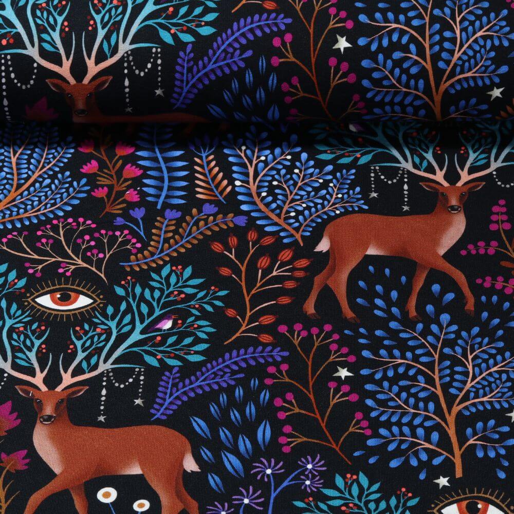 Mystiek, modern en een echte blikvanger: deze organische sweat betovert met een diepzwarte achtergrond waarop fijne, lichtgekleurde lijnen een fascinerend, bijna magisch patroon tekenen. De grafische ornamenten doen denken aan gloeiende nachtlampjes of filigraanconstellaties en geven de stof een bijzondere, mysterieuze uitstraling.