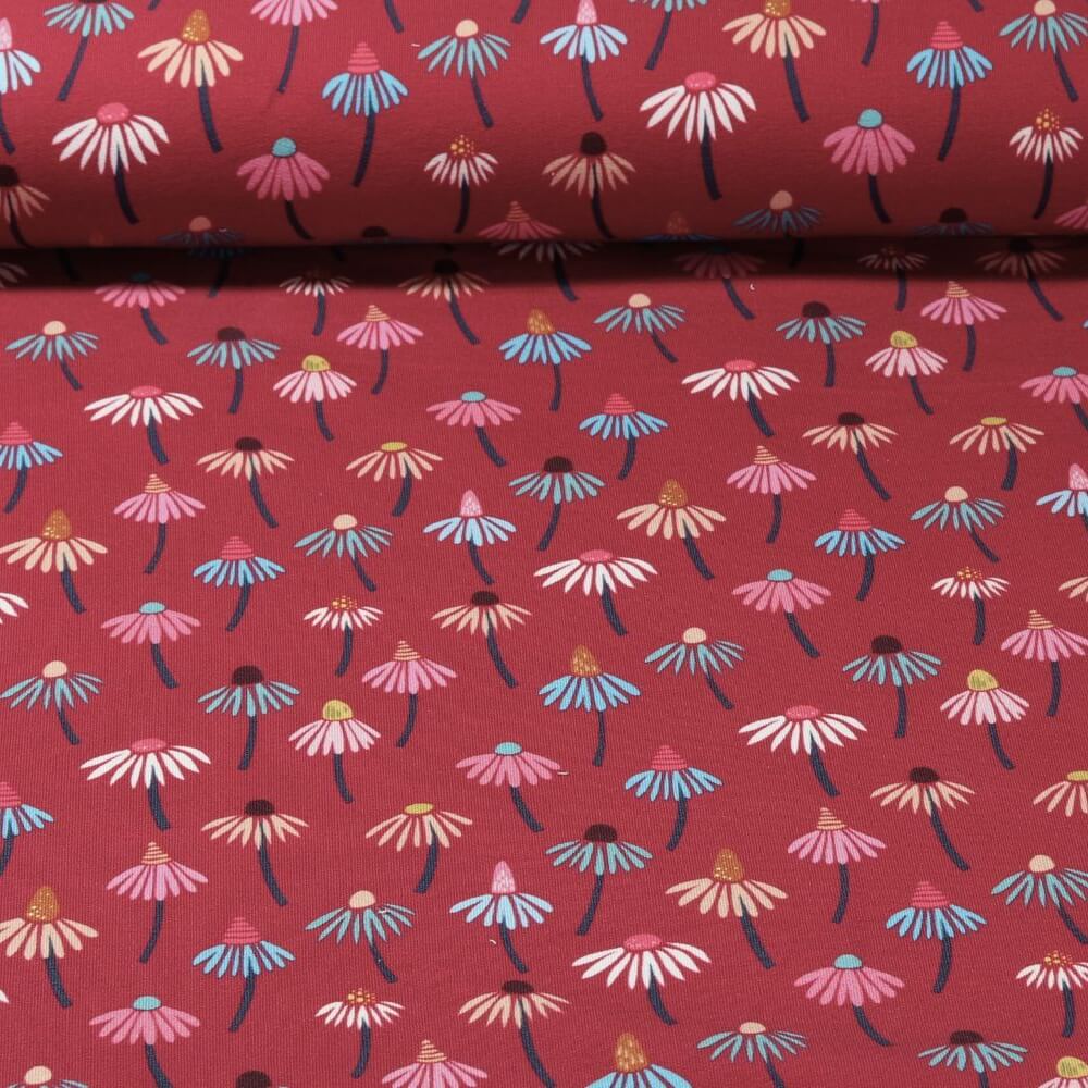 Een stof als een vuurwerk van goed humeur: talloze gestileerde madeliefjes bloeien in vrolijke kleuren op een felrode achtergrond. Delicate bloemblaadjes in wit en roze ontmoeten warm geel en accenten in roze en oranje - dicht bij elkaar als een vrolijke bloemenzee.