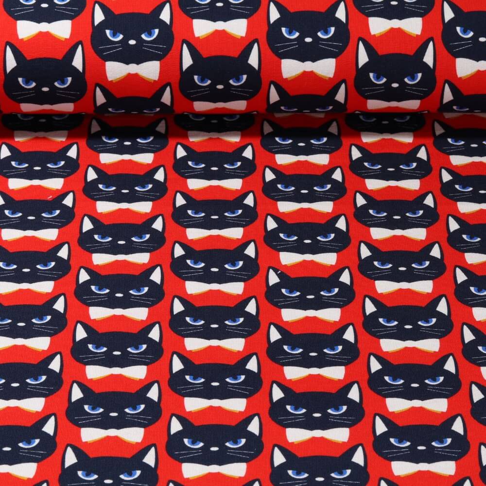 Een stof om verliefd op te worden - speels, brutaal en absoluut opvallend! Stijlvolle kattenkoppen in het typische ontwerp dartelen op een felrode achtergrond: soms met een kroontje, soms met een bril, soms met sprankelende details die doen denken aan oogverblindende sieraden en "bling bling". Daartussen voegen kleine sterren, stippen en grafische elementen moderne accenten toe en maken het patroon levendig en uniek.