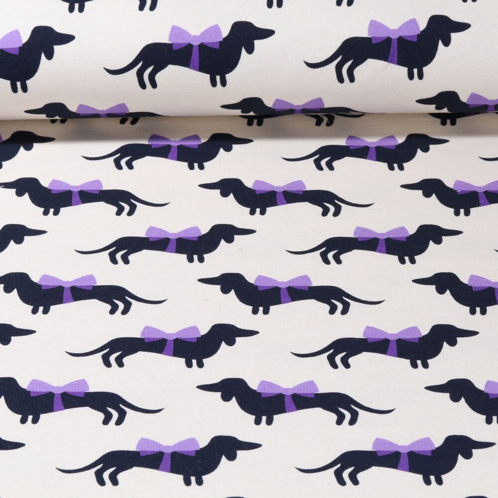 Een stof om verliefd op te worden - voor iedereen die van teckels en ongewone ontwerpen houdt! De zachte ecru achtergrond is versierd met stijlvolle Wienerhonden die meteen in het oog springen met hun glinsterende feestbrillen, fonkelende details en vrolijke kleuren.