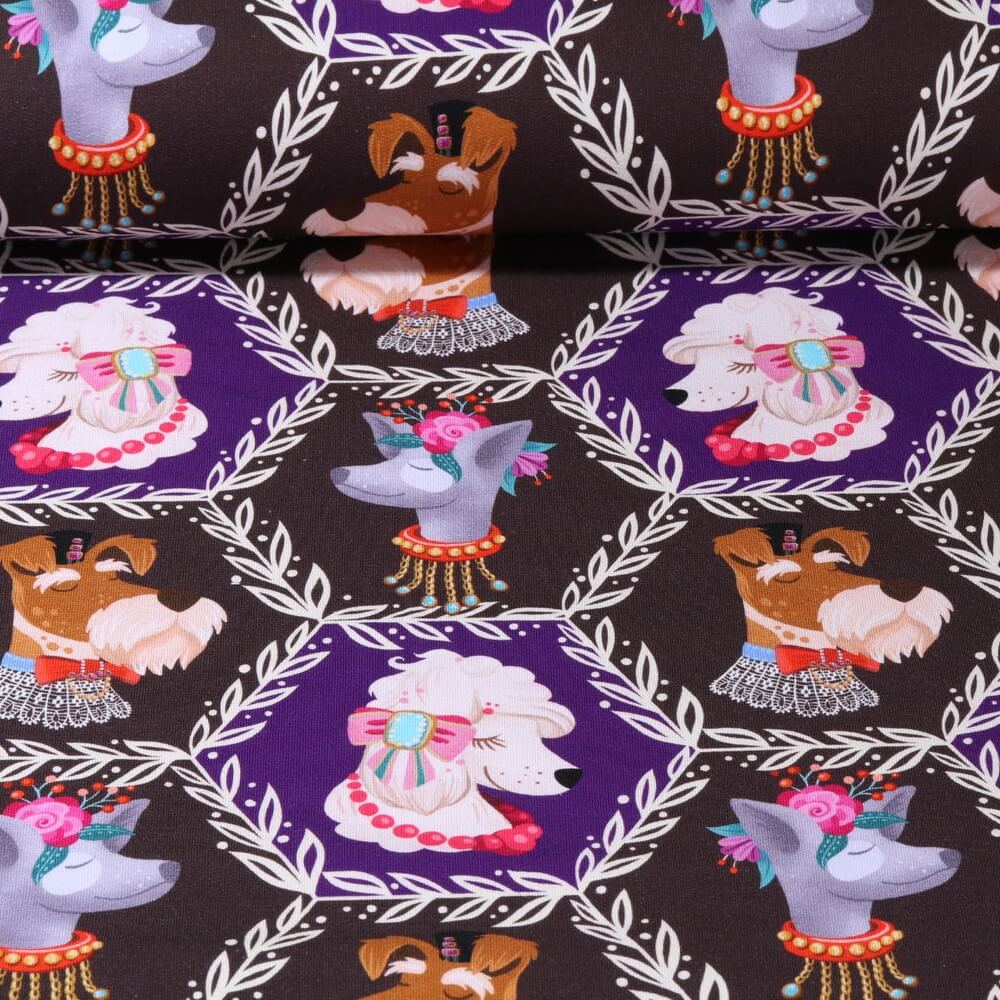 Een stof om verliefd op te worden - vrolijk, speels en met een extra dosis glamour! De warme, middenbruine achtergrond is versierd met schattige hondjes in verschillende poses, liefdevol geïllustreerd in de typische stijl. Delicate crème- en beigetinten, zacht roze, accenten in zwart en kleine, fonkelende "bling bling" details maken het ontwerp levendig en modern.