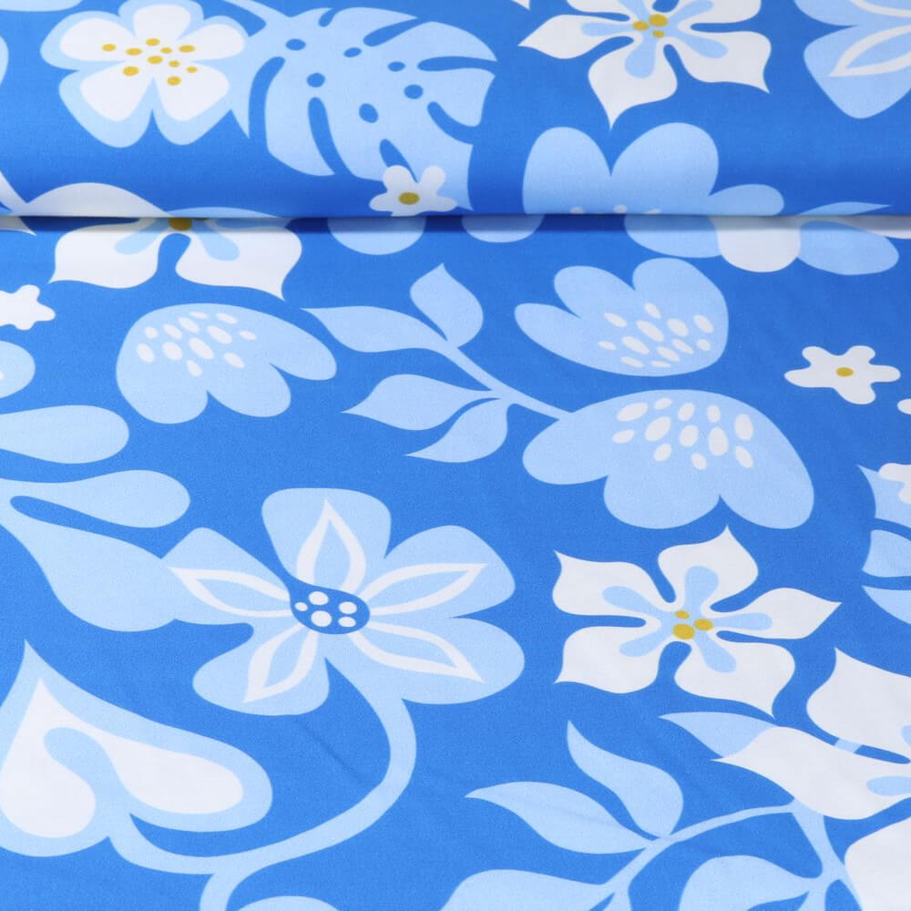 Deze fijne katoensatijnen stof betovert met een levendige digitale print in frisse blauwtinten. Fijne, harmonieus op elkaar afgestemde nuances - van delicaat lichtblauw tot helder middenblauw en diepere, intensere blauwtinten - vloeien zacht in elkaar over en creëren een moderne maar tijdloos elegante look.