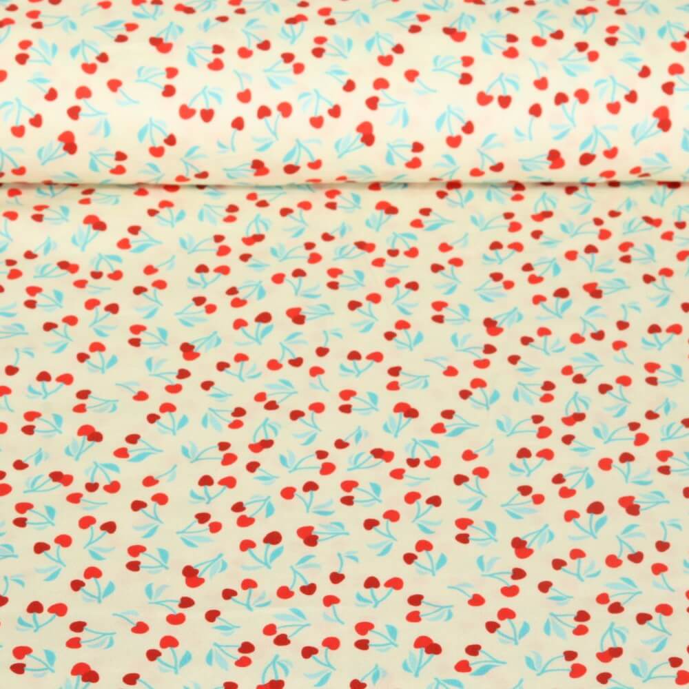 Een zomerse stof gemaakt voor dagen in de buitenlucht: De delicate ecru achtergrond is bezaaid met sappige, felrode kersen met fijne groene blaadjes - alsof ze net vers van de boom geplukt zijn. Het gedetailleerde digitale printontwerp doet denken aan een vrolijke picknick in de tuin en straalt pure lichtheid en goed humeur uit.