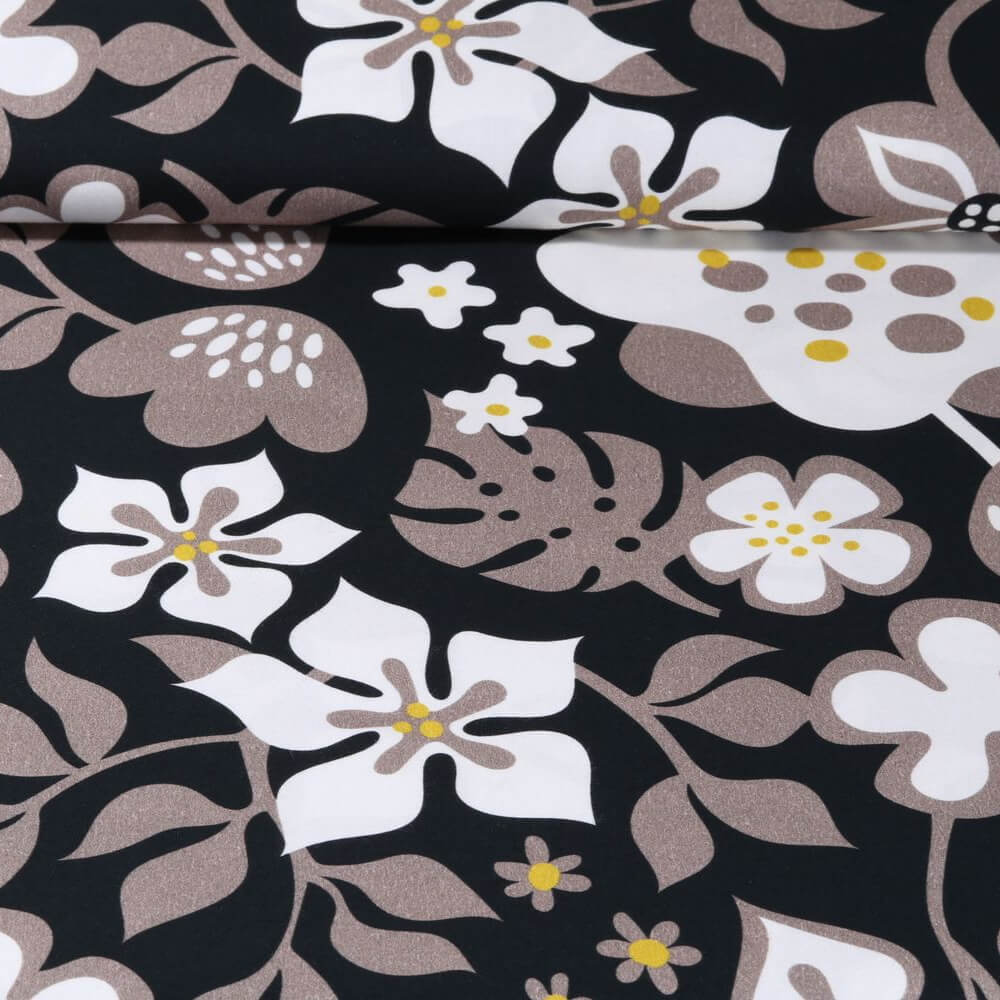 Deze elegante stof van katoensatijn verleidt met een expressieve digitale print op een diepzwarte achtergrond. Fijne, gedetailleerde motieven in levendige kleuren steken effectief af tegen de donkere achtergrond en geven de stof een moderne maar zeer stijlvolle uitstraling.