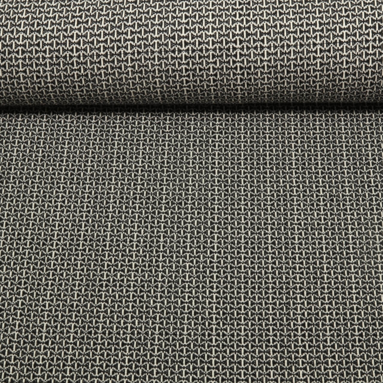 Deze bijzondere jacquard-jersey combineert een speels ontwerp met stijlvolle elegantie. Een fijn, gelijkmatig patroon van kleine, gestileerde strikjes, dat doet denken aan delicate kevervleugels en kleine insecten, ontvouwt zich op een diepzwarte achtergrond. De subtiele, driedimensionale jacquardtextuur geeft de stof een hoogwaardige uitstraling en maakt het patroon voelbaar.