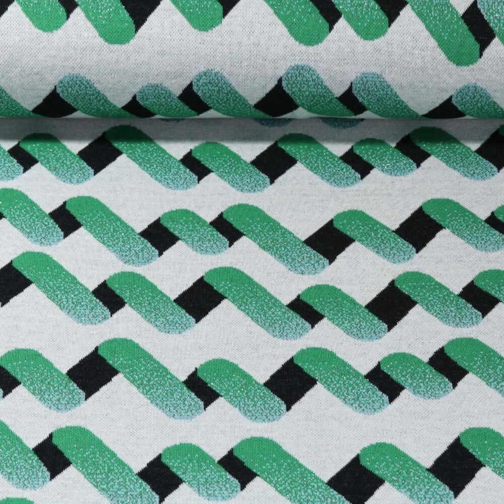 Deze jacquard tricot van Hamburger Liebe geeft een frisse wind door je naaiprojecten met zijn moderne "op en neer" dessin. Gestileerde zigzaglijnen in levendig groen lopen over een subtiele grijze achtergrond, wat de stof een grafische maar harmonieuze uitstraling geeft.