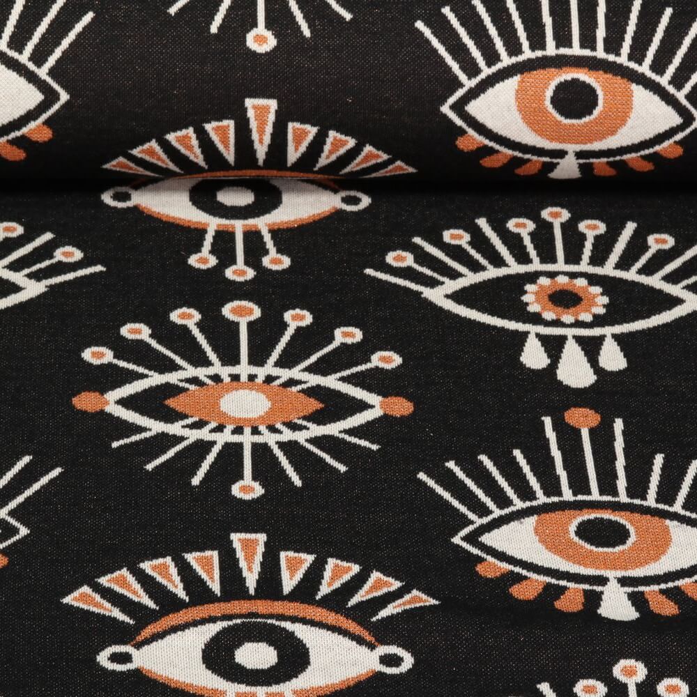 Dompel jezelf onder in de magische wereld van dit ontwerp. Gestileerde ogen in zachtroze en warme beige tinten schitteren op een diepzwarte achtergrond, fijn geaccentueerd met heldere glansaccenten. Het grafische patroon is zowel mystiek als modern - een echte blikvanger die elk naaiproject een speciale uitstraling geeft.