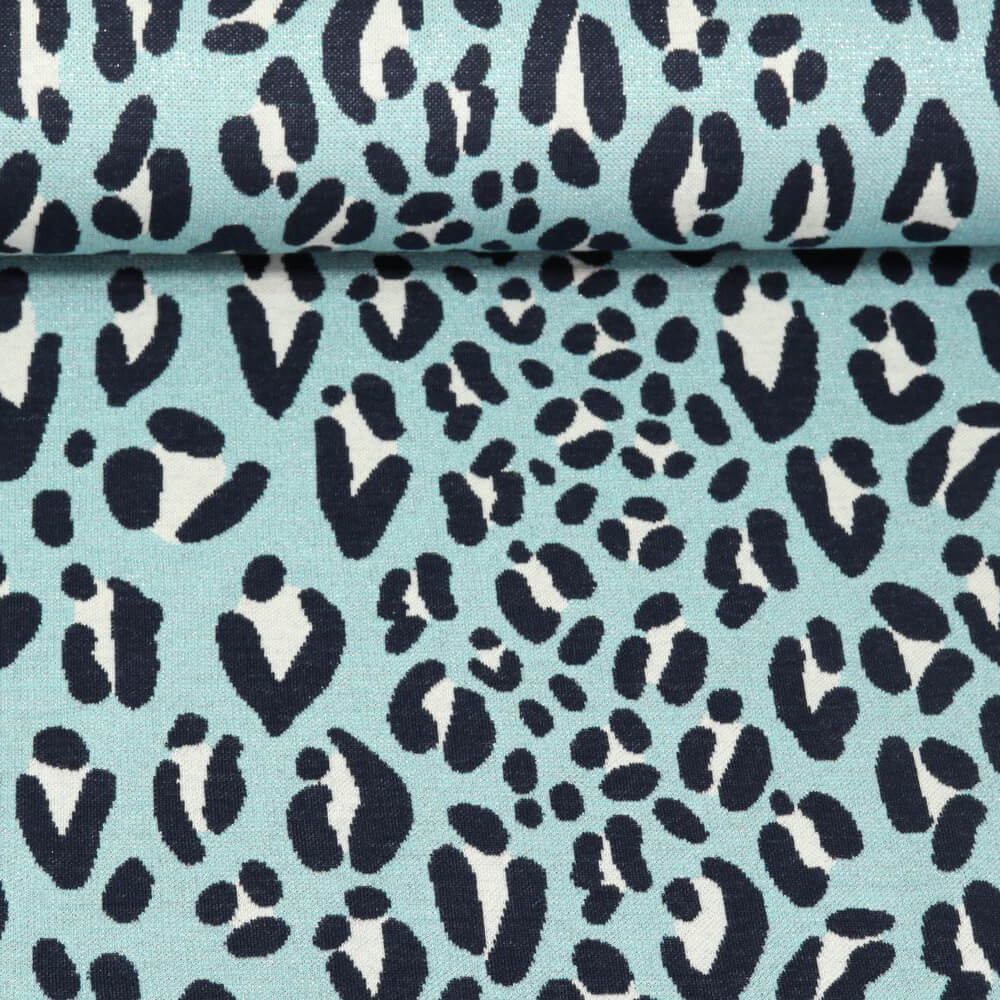 Dompel jezelf onder in de magische wereld van "Magical Shimmer Safari": deze speciale jacquard-jersey betovert met een modern luipaarddessin in frisse turquoise tinten. Delicate, heldere kleuraccenten ontmoeten een gestileerd leopatroon dat eruitziet als een glinsterende jungle - wild, speels en heerlijk elegant tegelijk.