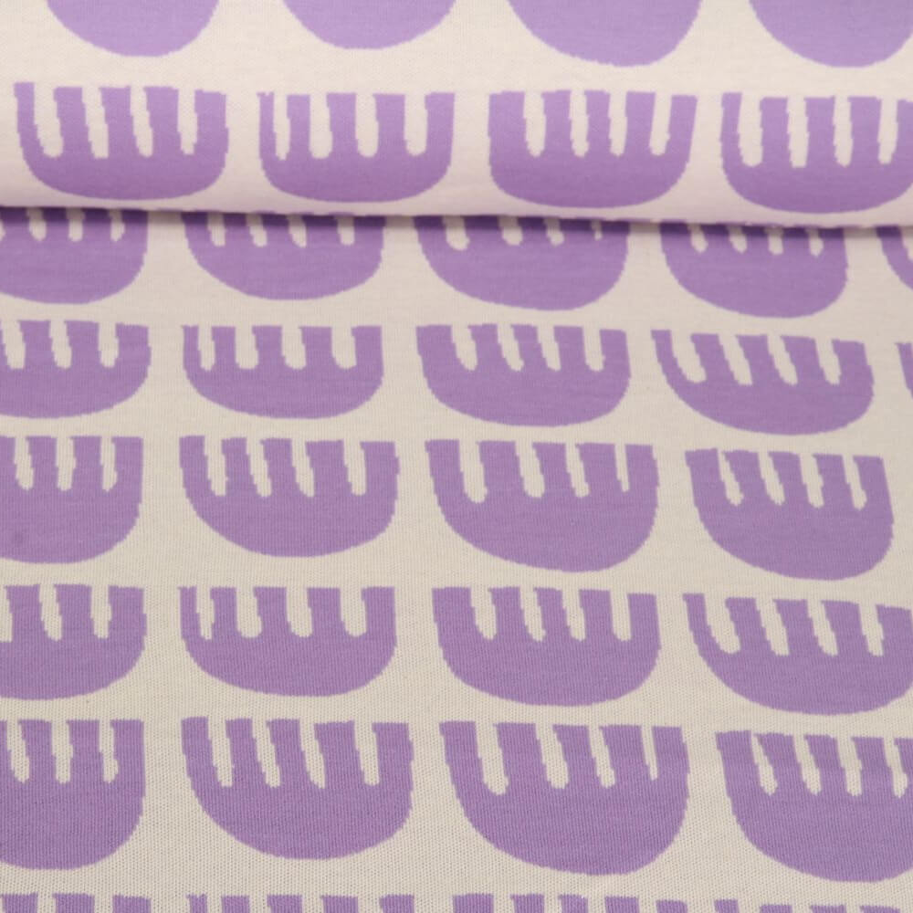 Stel je een zonnige picknickdag voor - onze jacquard jersey vangt precies dit gevoel. Gestileerde tulpen in verschillende tinten lila, van zacht pastel tot rijker paars, verstrengelen zich op een delicate, lichte achtergrond. Fijne, grafische details geven het patroon een modern, Scandinavisch tintje zonder iets van de speelsheid te verliezen.