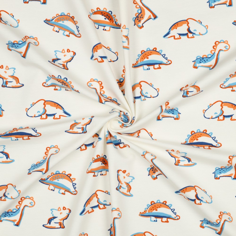 Tussen de dino's zijn liefdevolle details te ontdekken zoals stippen, vlekken en kleine grafische elementen die het ontwerp een moderne, speelse touch geven. De zachte jersey valt soepel en volgt elke beweging – ideaal voor comfortabele kinderkleding, losse broekjes, shirts, leggings, pyjama’s of schattige babykleding.