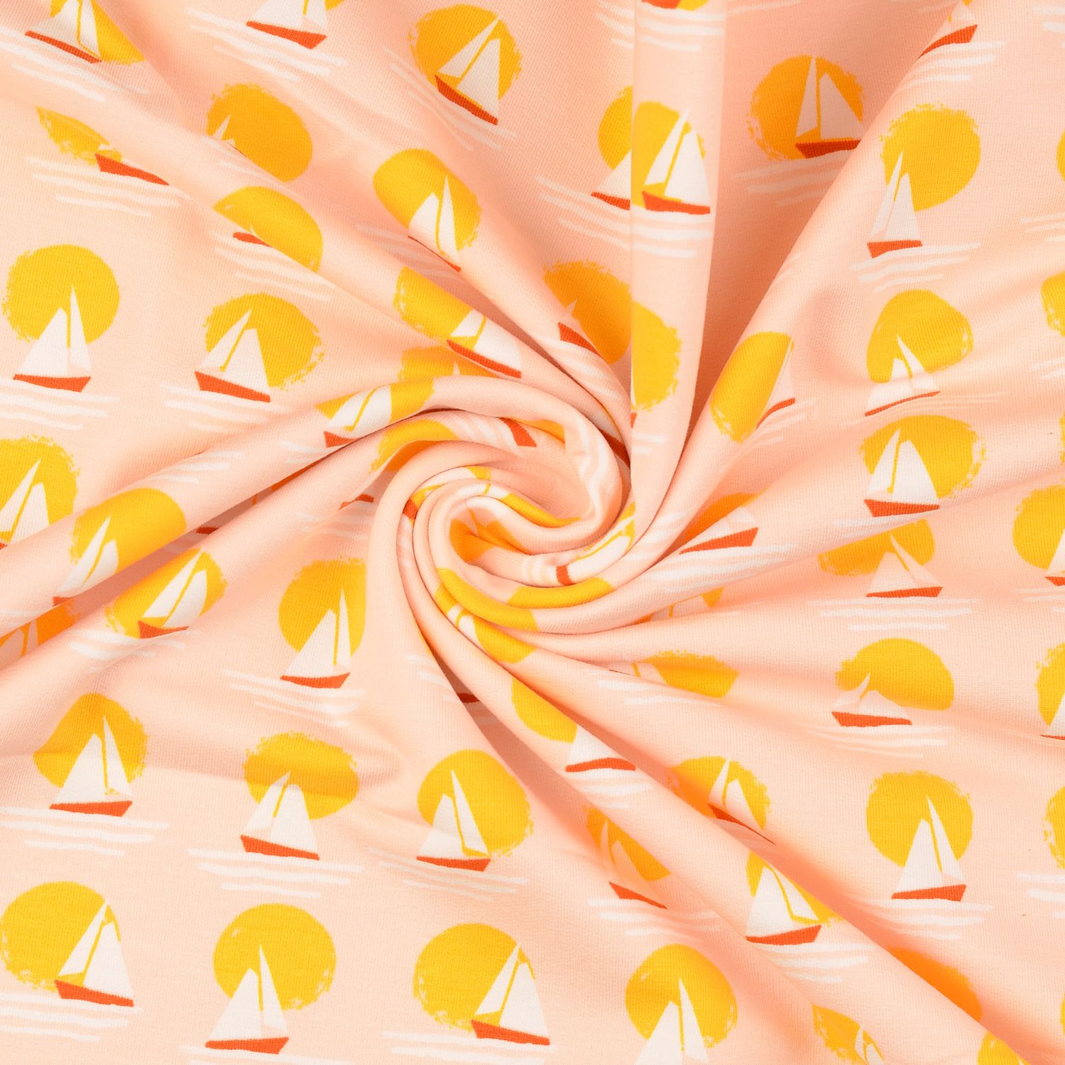 Het zachte roze in combinatie met de maritieme motieven maakt deze stof tot een favoriete metgezel voor iedereen die van gezelligheid houdt, maar dan stijlvol. Of het nu gaat om dagelijks gebruik, de kinderopvang of knuffeltijd thuis – met deze zeilboot French Terry ontstaan favoriete kledingstukken met een gegarandeerd comfortgevoel.