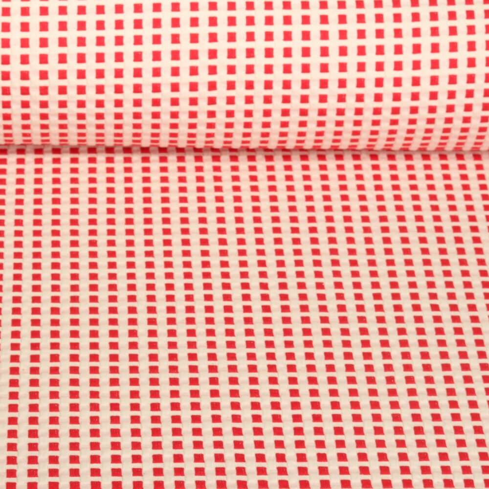 Deze betoverende wafeltrui brengt meteen een picknickstemming in je naaiprojecten. Het stofontwerp heeft een levendig, helder rood dat doet denken aan rijpe aardbeien en geruite picknickdekens - warm, vrolijk en absoluut perfect voor een goed humeur.