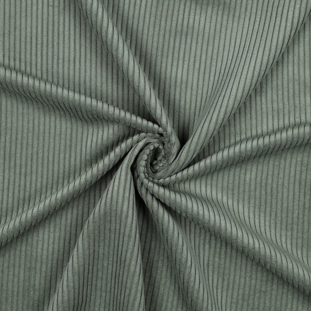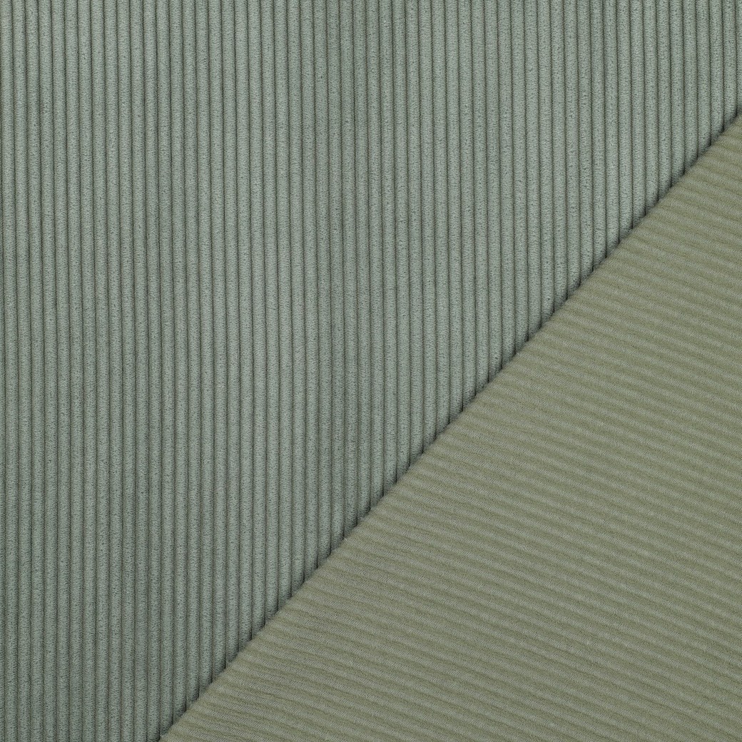 Dit brede corduroy in elegant legergroen combineert casual coolness met tijdloze elegantie. De opvallende geribbelde textuur met ca. 4,5 mm brede corduroy panelen geeft de stof een prachtige diepte en een subtiele vintage charme.