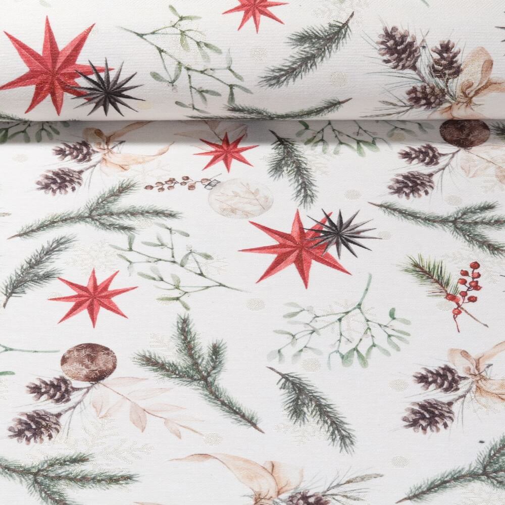 Een stof die rechtstreeks uit een winters sprookje komt: Delicate gouden sterren en fijne takjes glinsteren op de natuurlijke ecru kleur in een verfijnde linnenlook. De jacquardtextuur geeft het dessin diepte en benadrukt de subtiele glitter van de lurex - elegant, maar niet overheersend.