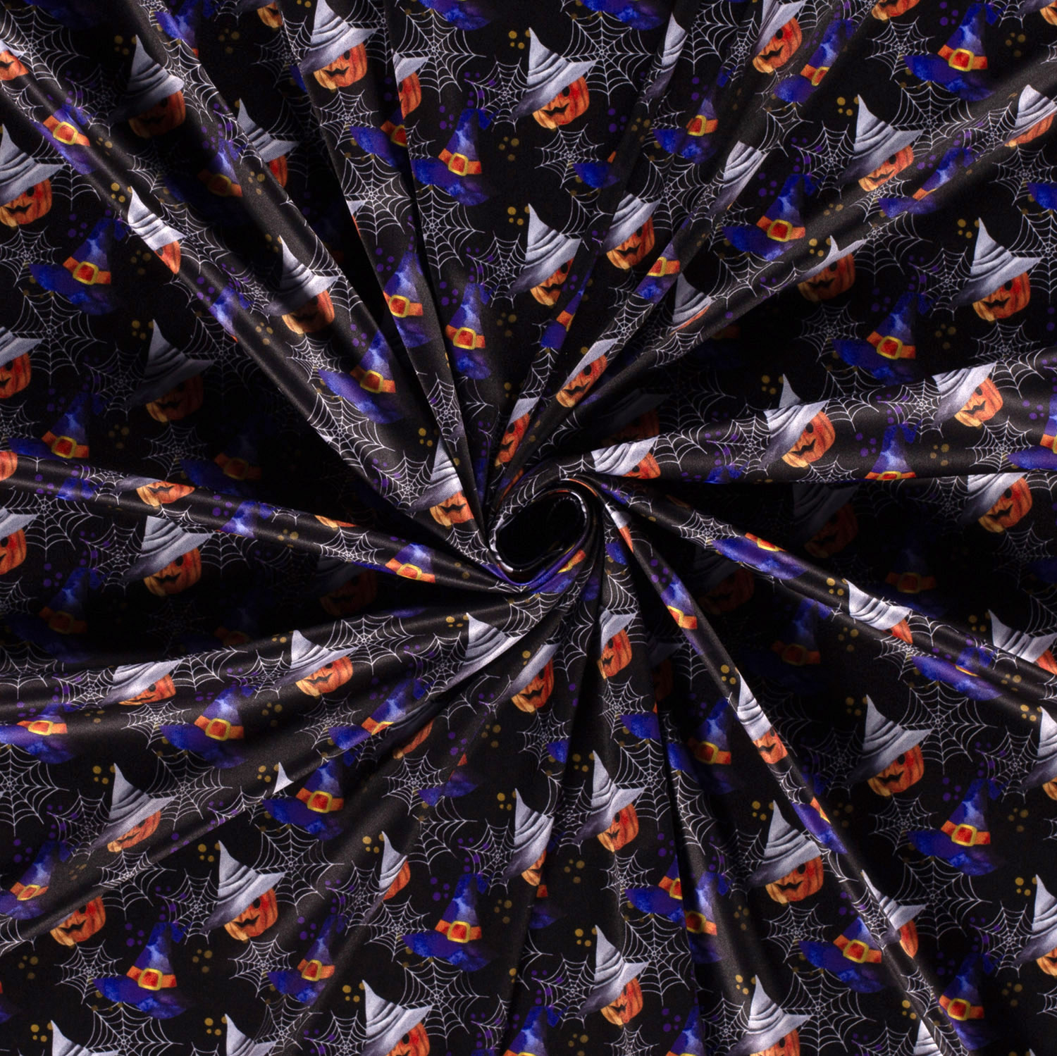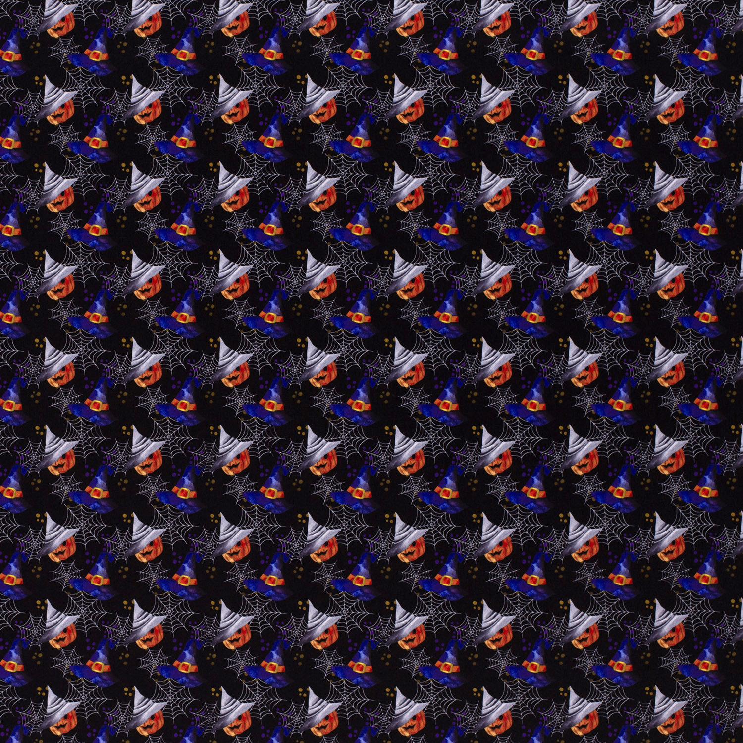 Met deze carnavalsstof haal je echte heksensfeer in je naaihoekje! Op een donkere achtergrond stralen brutale heksenhoeden in krachtig oranje, mystiek paars en diep zwart – deels met gespen, deels met brede hoedenranden, allemaal verschillend van vorm en verspringend gerangschikt. Tussen de hoeden zorgen kleine sterretjes en speelse details voor een magisch fonkelende look.