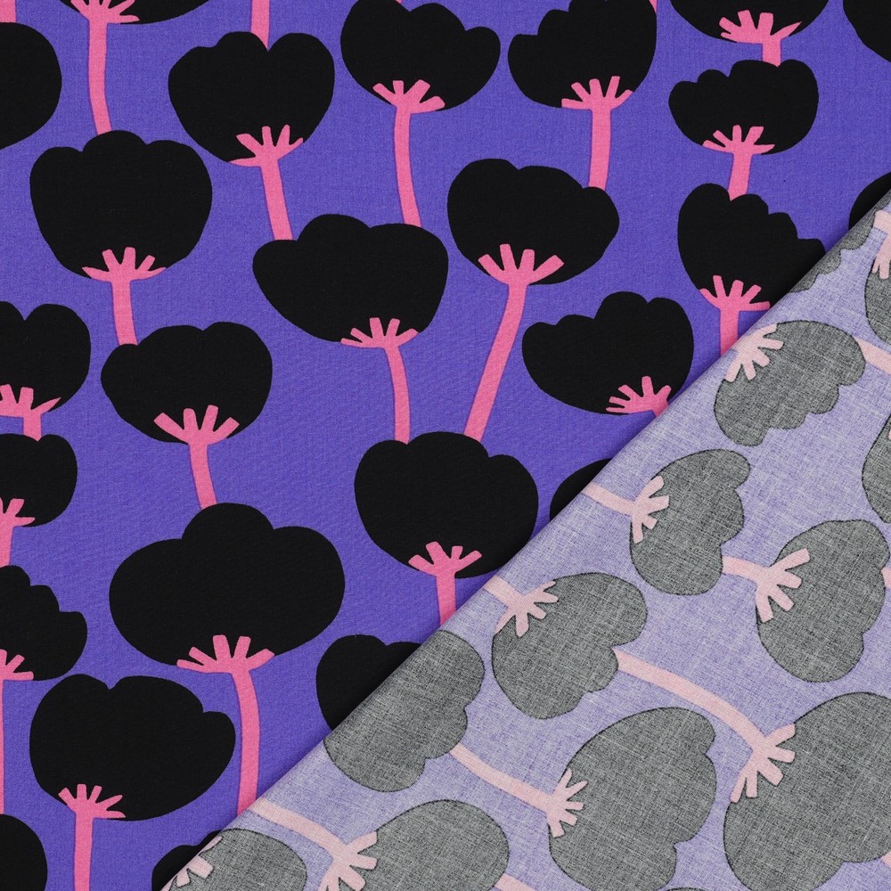 Een zee van klaprozen in delicate paarse en lila tinten - deze stof van Nerida Hansen betovert op het eerste gezicht. Speelse, gestileerde klaprozen dansen over de stof en combineren moderne graphics met vrouwelijke lichtheid. De harmonieuze combinatie van paarse nuances, zachte rosé accenten en subtiele contrasten maken het ontwerp een echte blikvanger zonder overheersend te zijn.