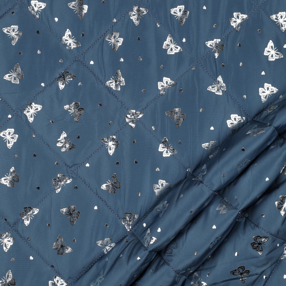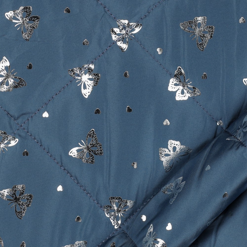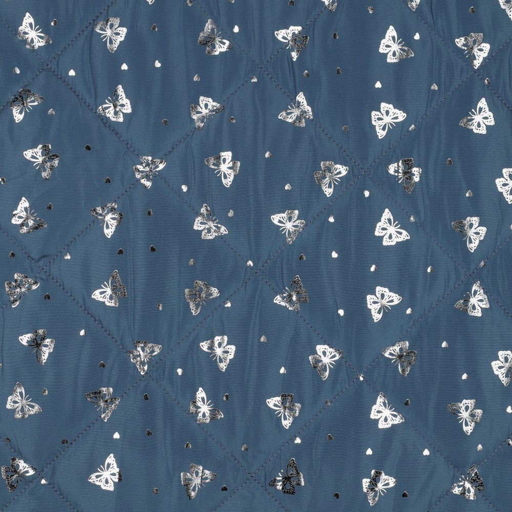 Gewatteerde Jasstof - Vlinders met Foliedruk Jeansblauw