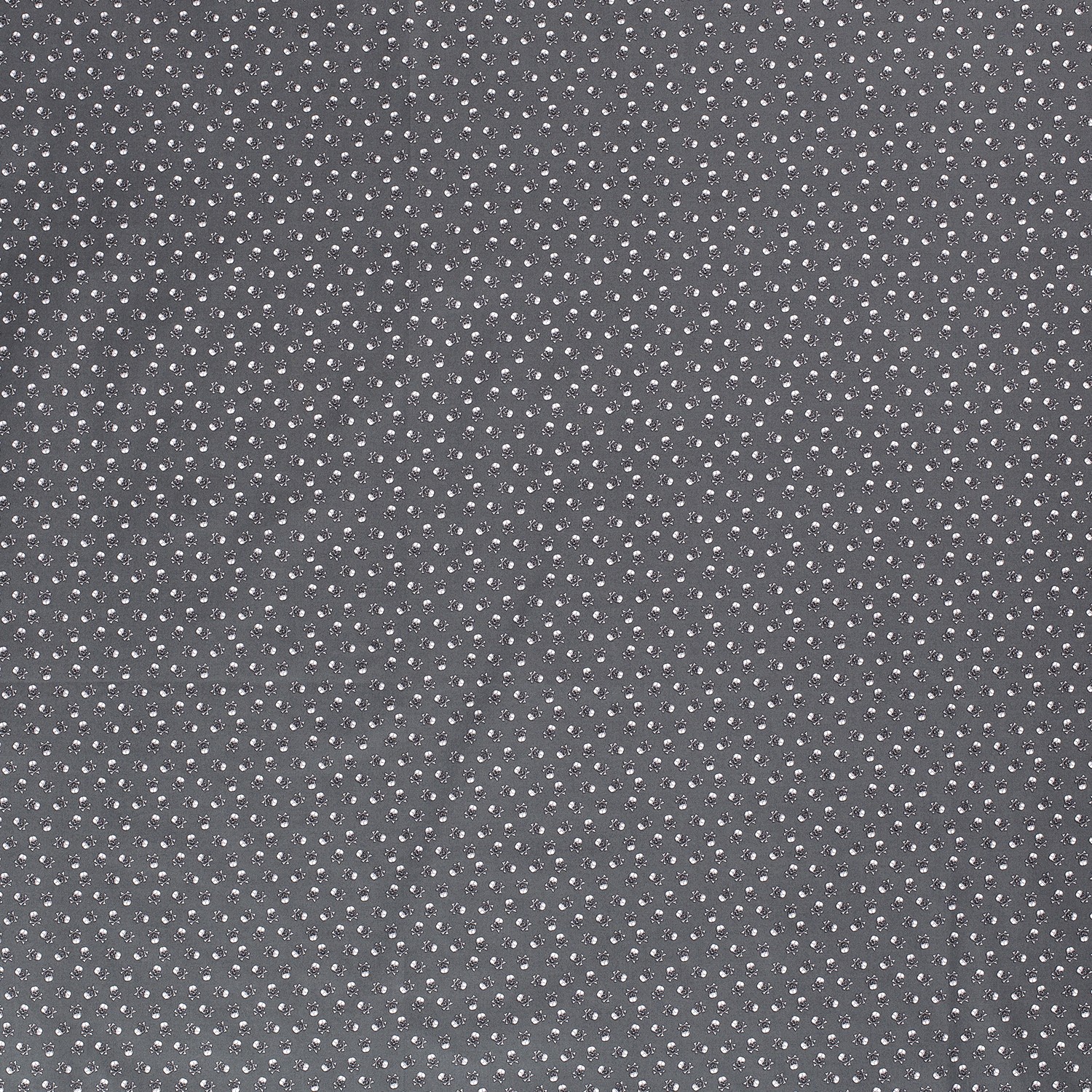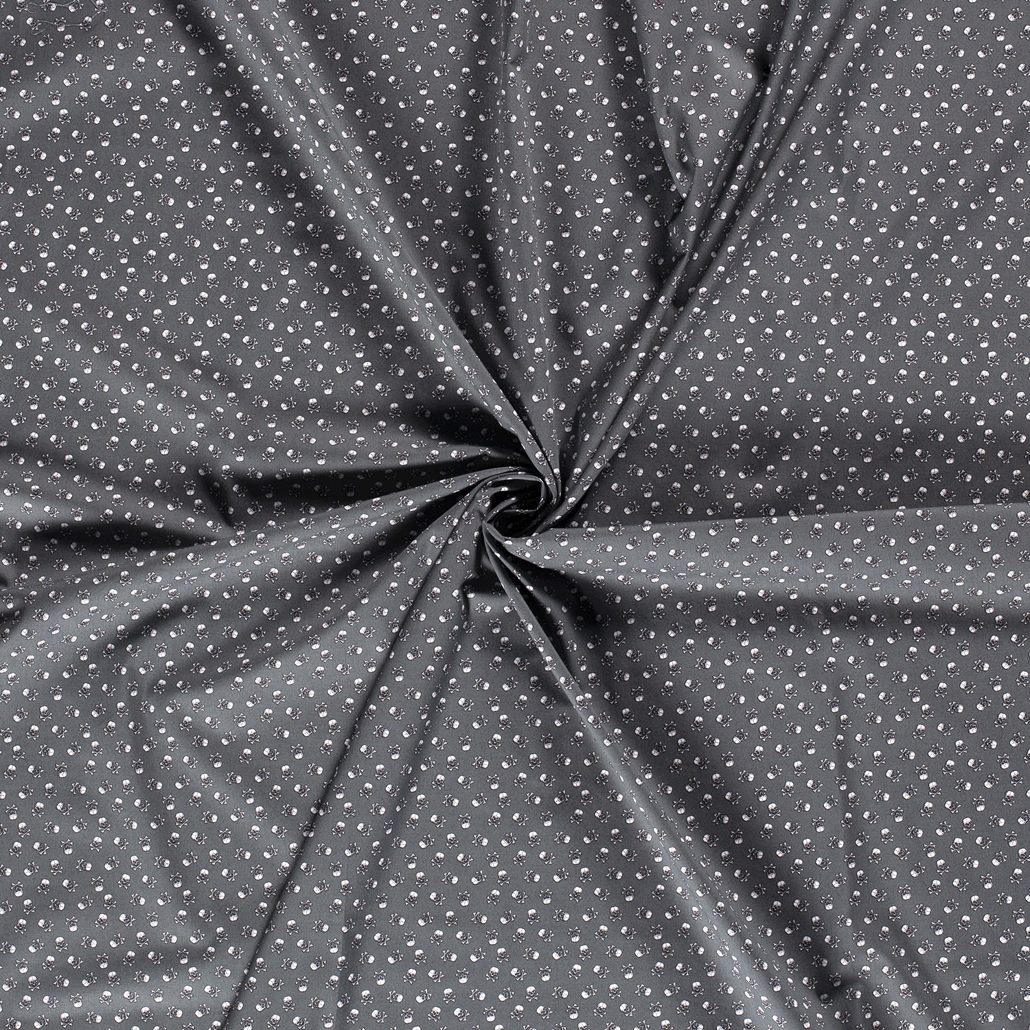 Een casual stof met een piratensfeer: Op een subtiele grijze achtergrond staan kleine witte schedels met gekruiste botten in rijen, wat een coole, licht rockende all-over print creëert. De fijne, gelijkmatige tekening van de schedels oogt modern en stijlvol – perfect voor iedereen die van piratenthema's houdt maar niet van te veel kleur.
