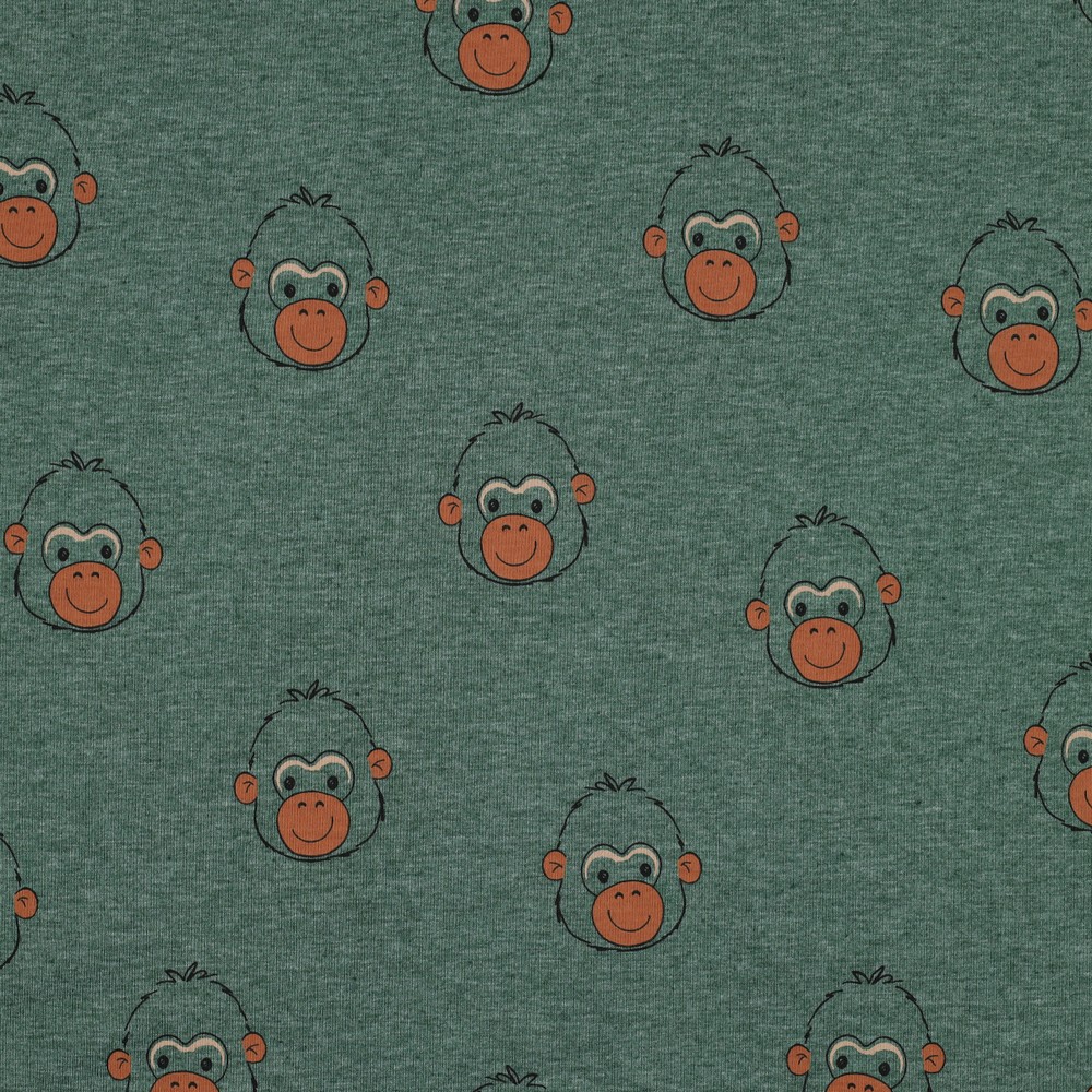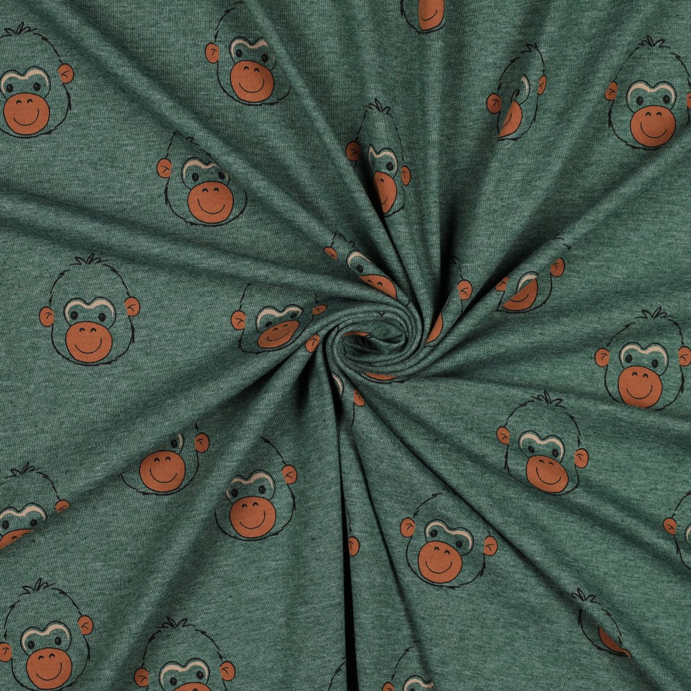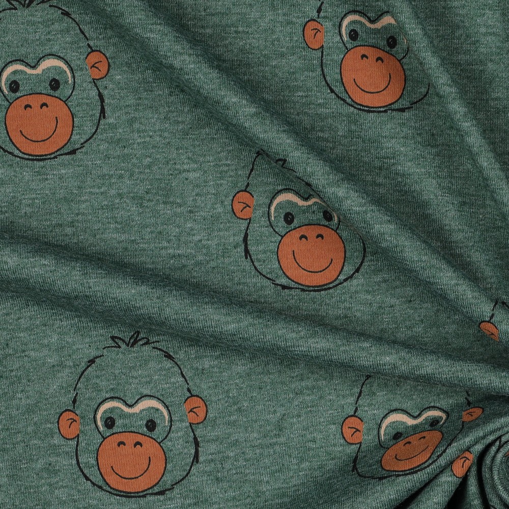 Een stof om verliefd op te worden: op een zacht gemêleerd groen dartelen vrolijke kleine aapjes rond, die met hun speelse blik direct voor een goed humeur zorgen. De subtiel gemêleerde uitstraling geeft de achtergrond een levendige, licht natuurlijke structuur, waarop de schattige aapjes extra goed uitkomen.