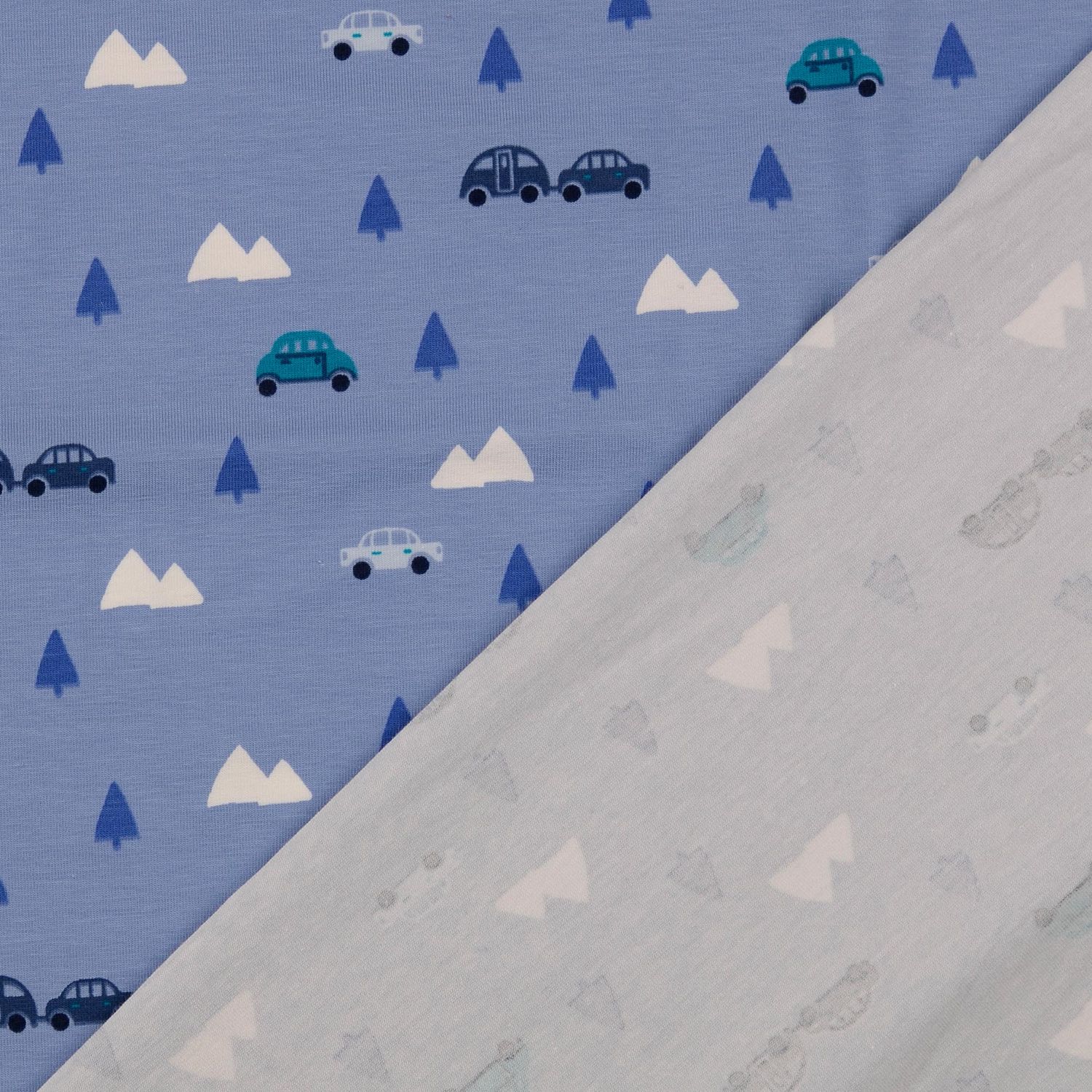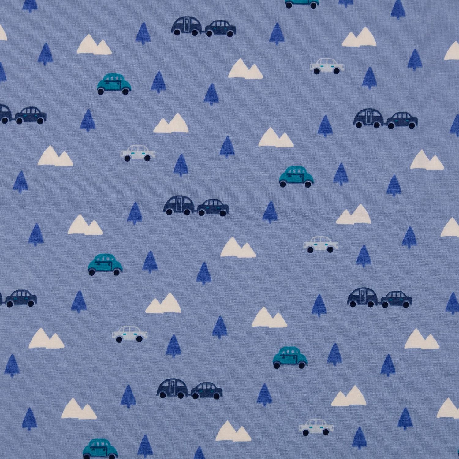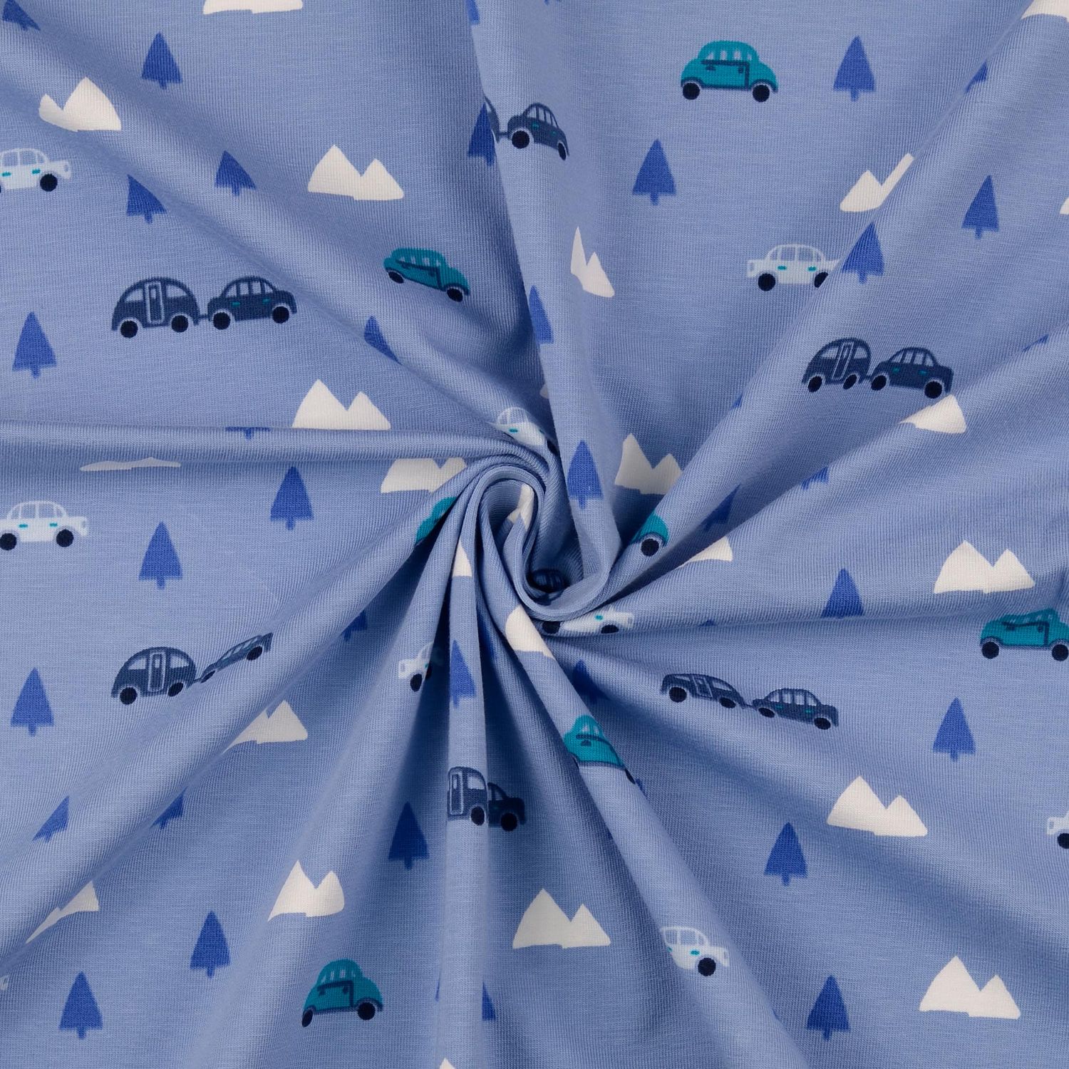 Met deze vrolijke jersey haal je echte campinggevoel in je naaihoekje! Op een lichtblauwe achtergrond spelen liefdevol geïllustreerde auto's met caravans, kleine tenten, bomen en gezellige kampvuren – als een klein vakantiescène om te dragen.