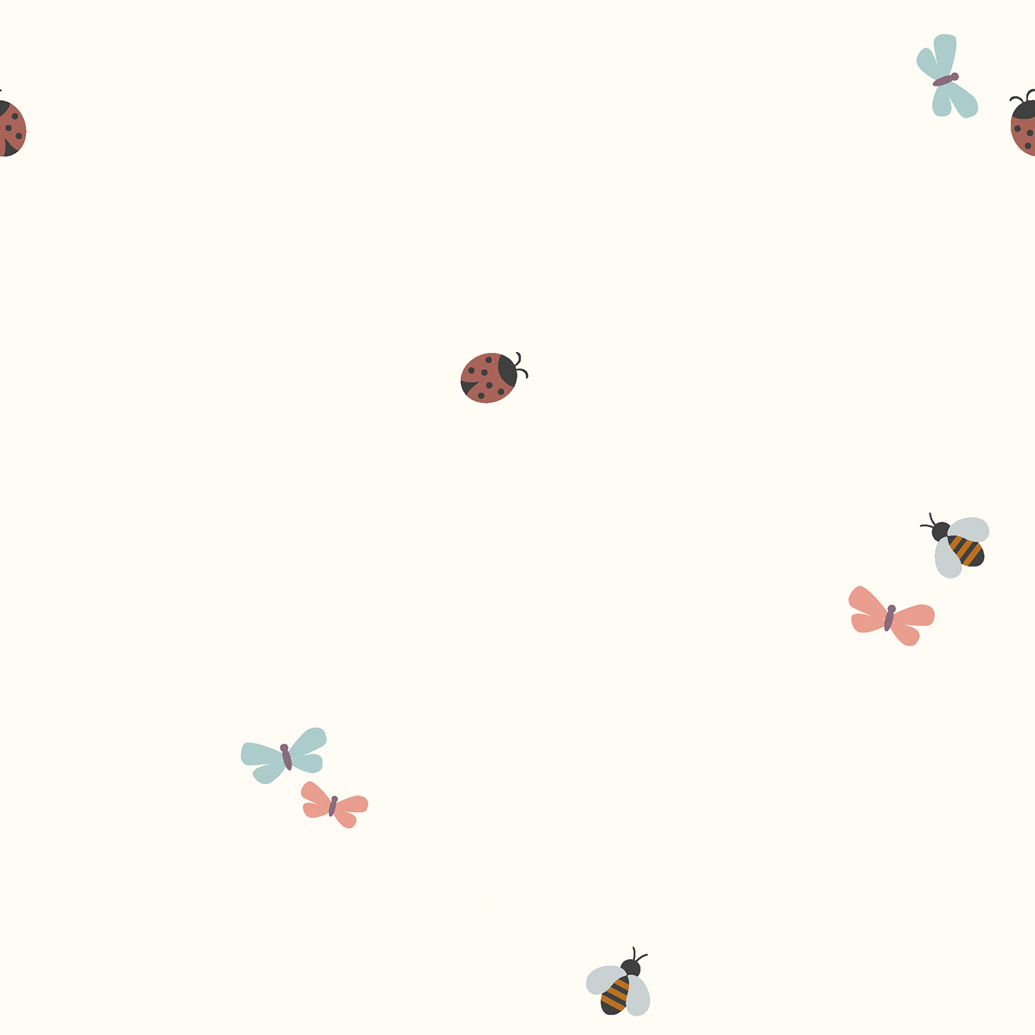 Een speelse jersey die direct vrolijk maakt: op de zachte offwhite achtergrond dartelen kleine, liefdevol geïllustreerde bijen en kevers in warme geel- en bruintinten, gecombineerd met subtiele accenten in zwart en een zachte oranje tint. De schattige insecten lijken vrolijk over een lentebloemenweide te dansen – perfect voor iedereen die van natuurmotieven houdt.