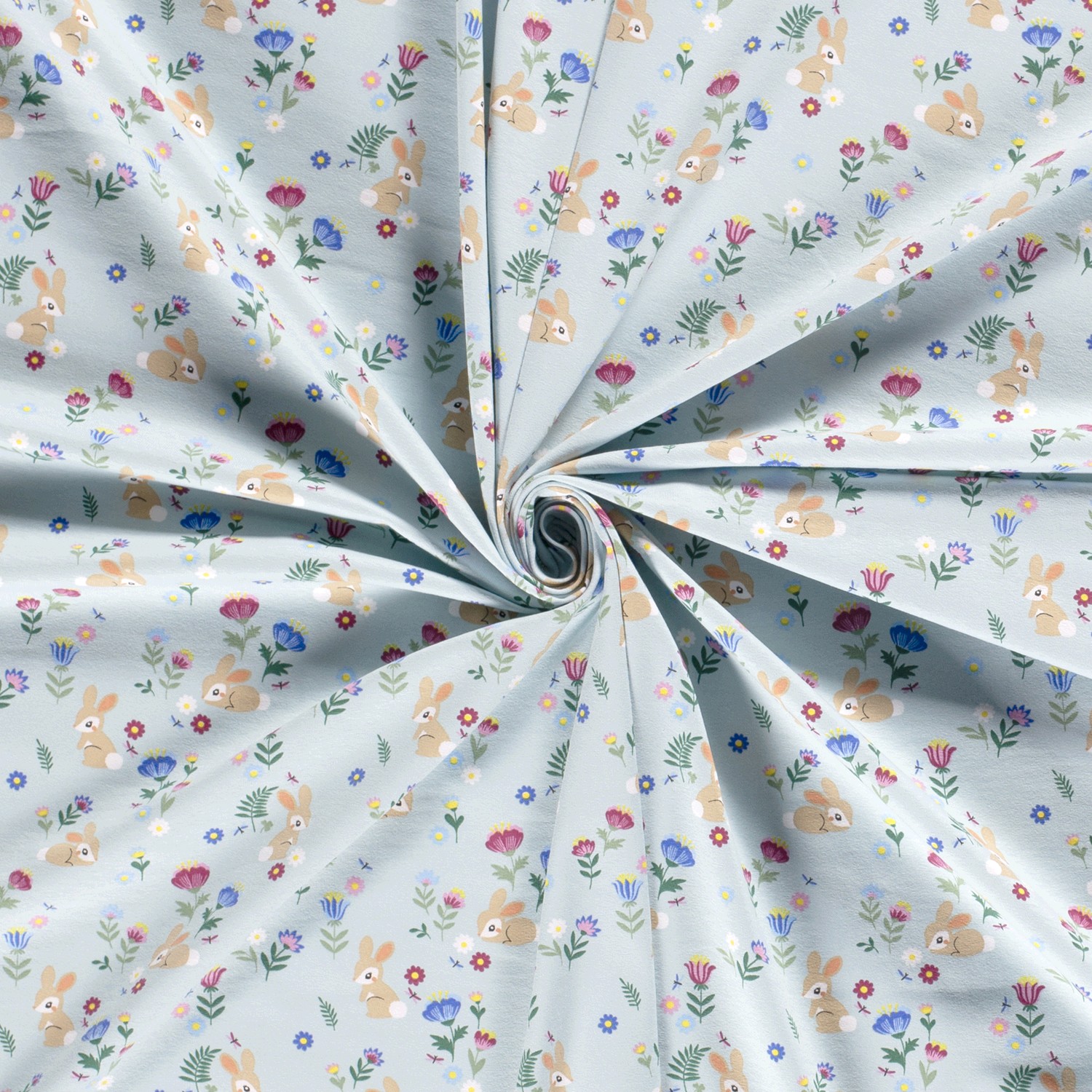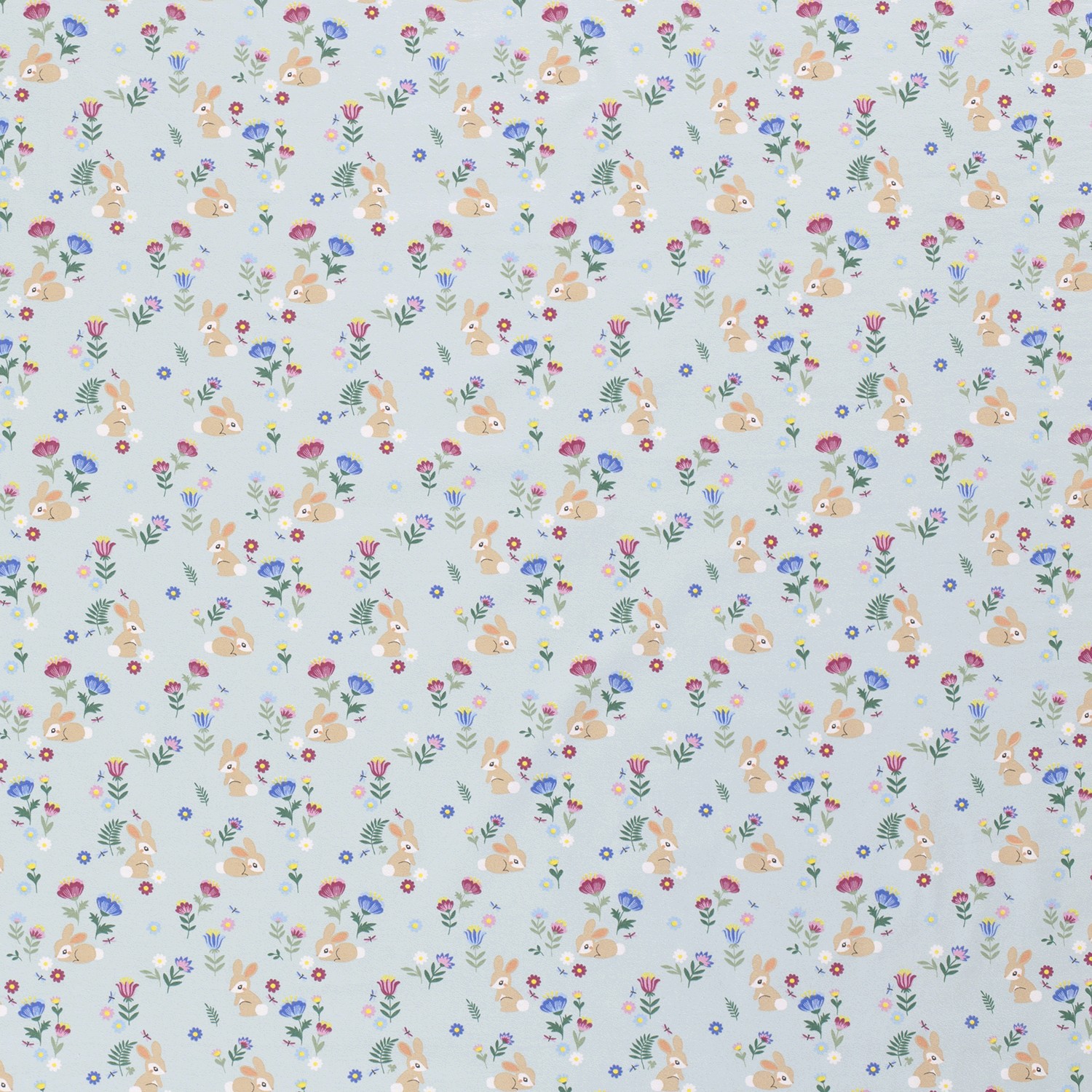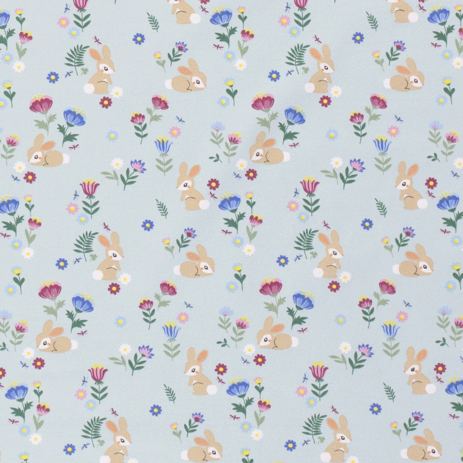 Zacht, speels en gewoon om verliefd op te worden: op een zachte lichtmint achtergrond dartelen kleine, liefdevol getekende konijntjes, omringd door fijne bloemen en delicate bladerranken. De subtiele pasteltinten in roze, crème en zacht groen geven het ontwerp een heerlijk harmonieuze, lenteachtige uitstraling.