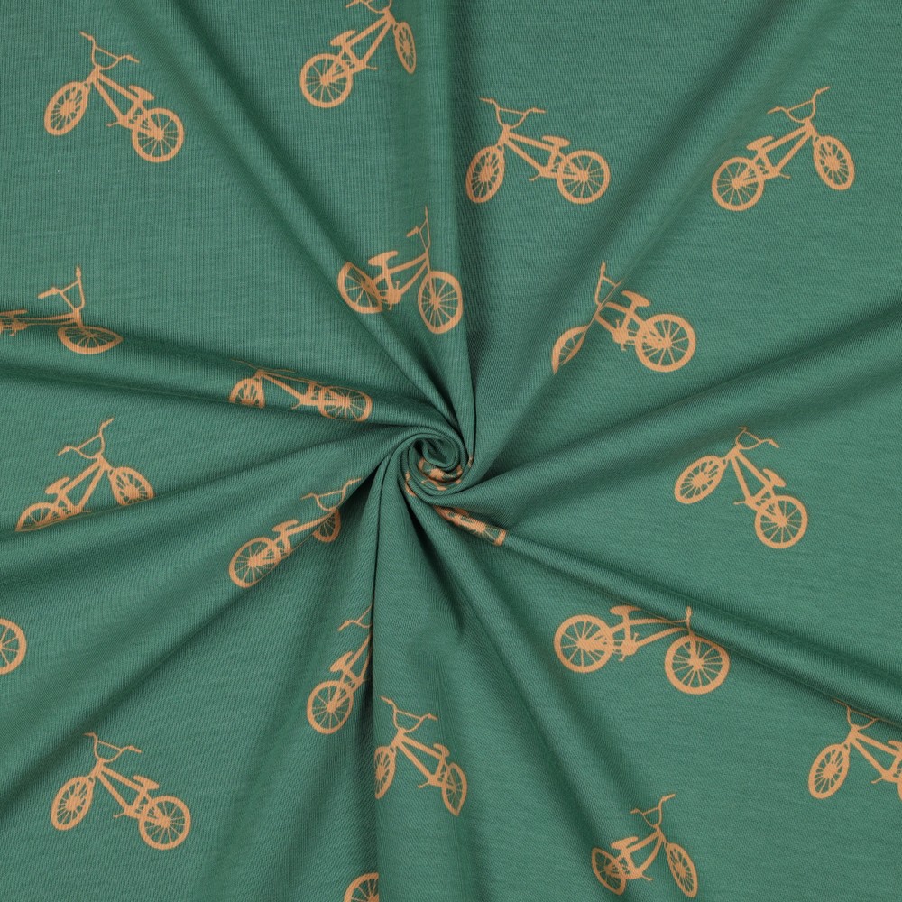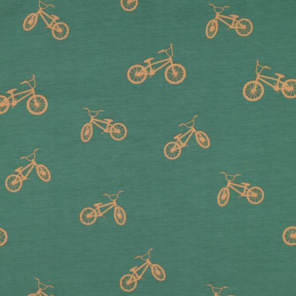 Actie voor kleine en grote fietsfanaten: Op een diepe groene achtergrond rijden stoere BMX-fietsen in verschillende kleuren over de stof en zorgen direct voor een vrolijke sfeer. De fietsen zijn liefdevol gedetailleerd getekend – met frames, wielen en sturen die zich dynamisch over de achtergrond verspreiden, alsof ze elk moment een stunt gaan uitvoeren.