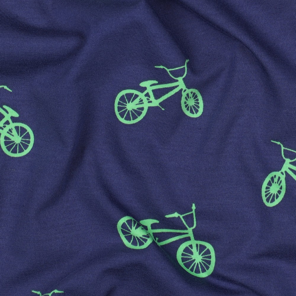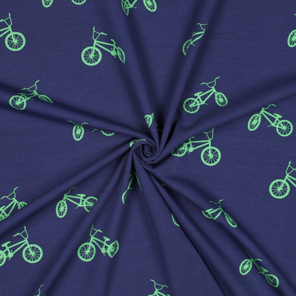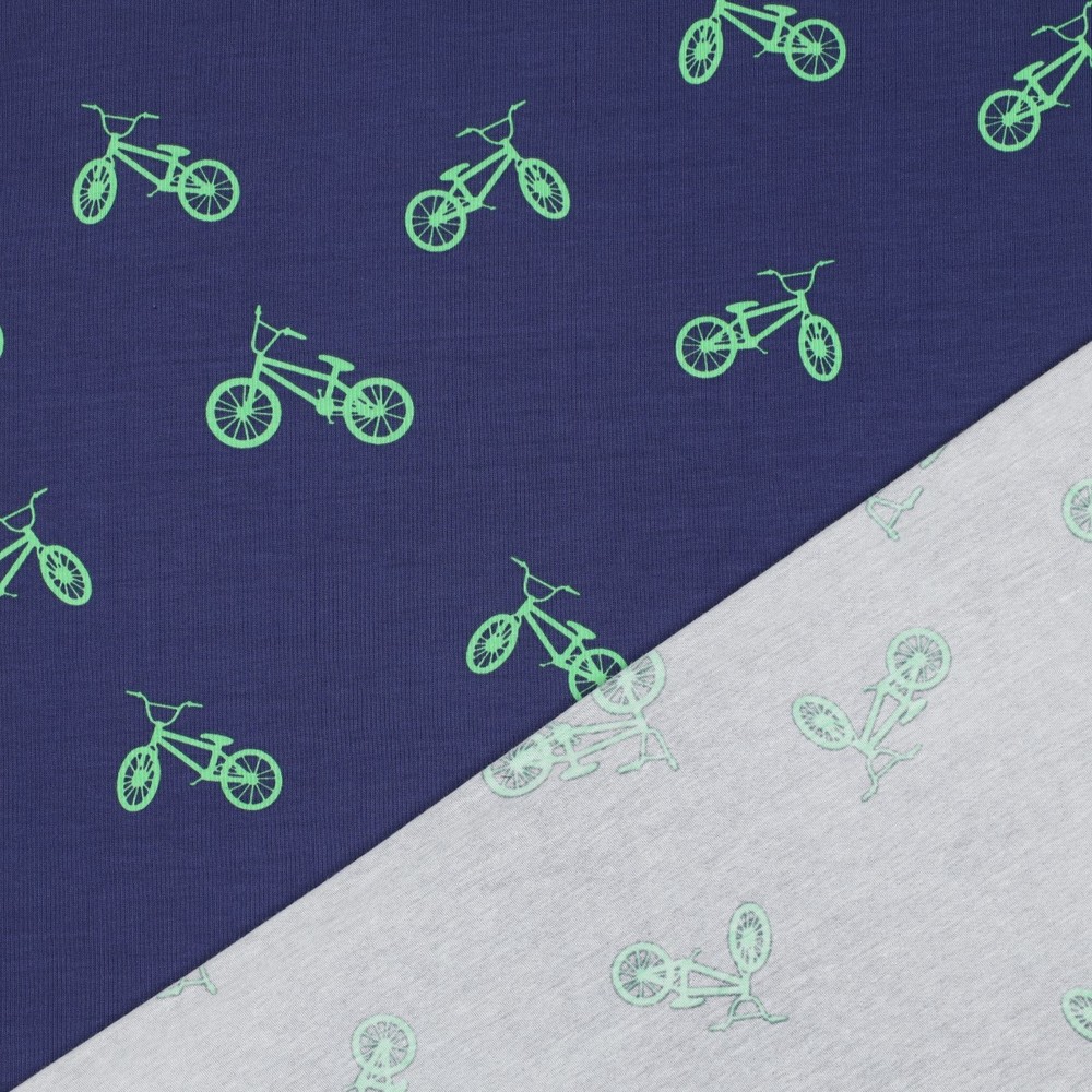 Met onze „Jersey – BMX Navy“ haal je echte street-action naar je naaitafel! Op een diepblauwe navy achtergrond zoeven gedetailleerd geïllustreerde BMX-fietsen in frisse kleuren zoals rood, lichtblauw, wit en geel over de stof – dynamisch, sportief en vol beweging. Kleine sterren en grafische elementen benadrukken de coole urban look en maken het ontwerp de perfecte metgezel voor kleine en grote fietsfanaten.