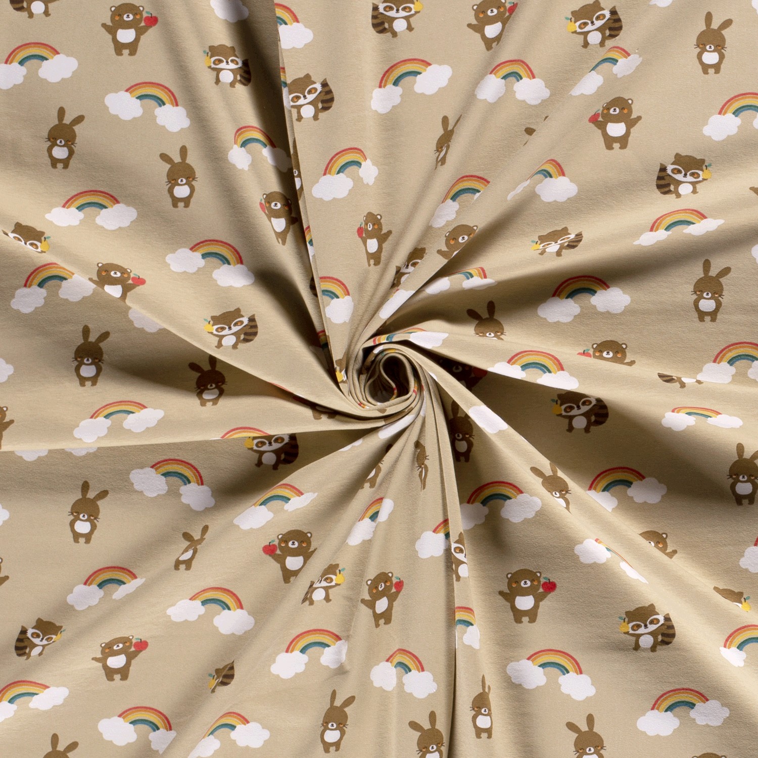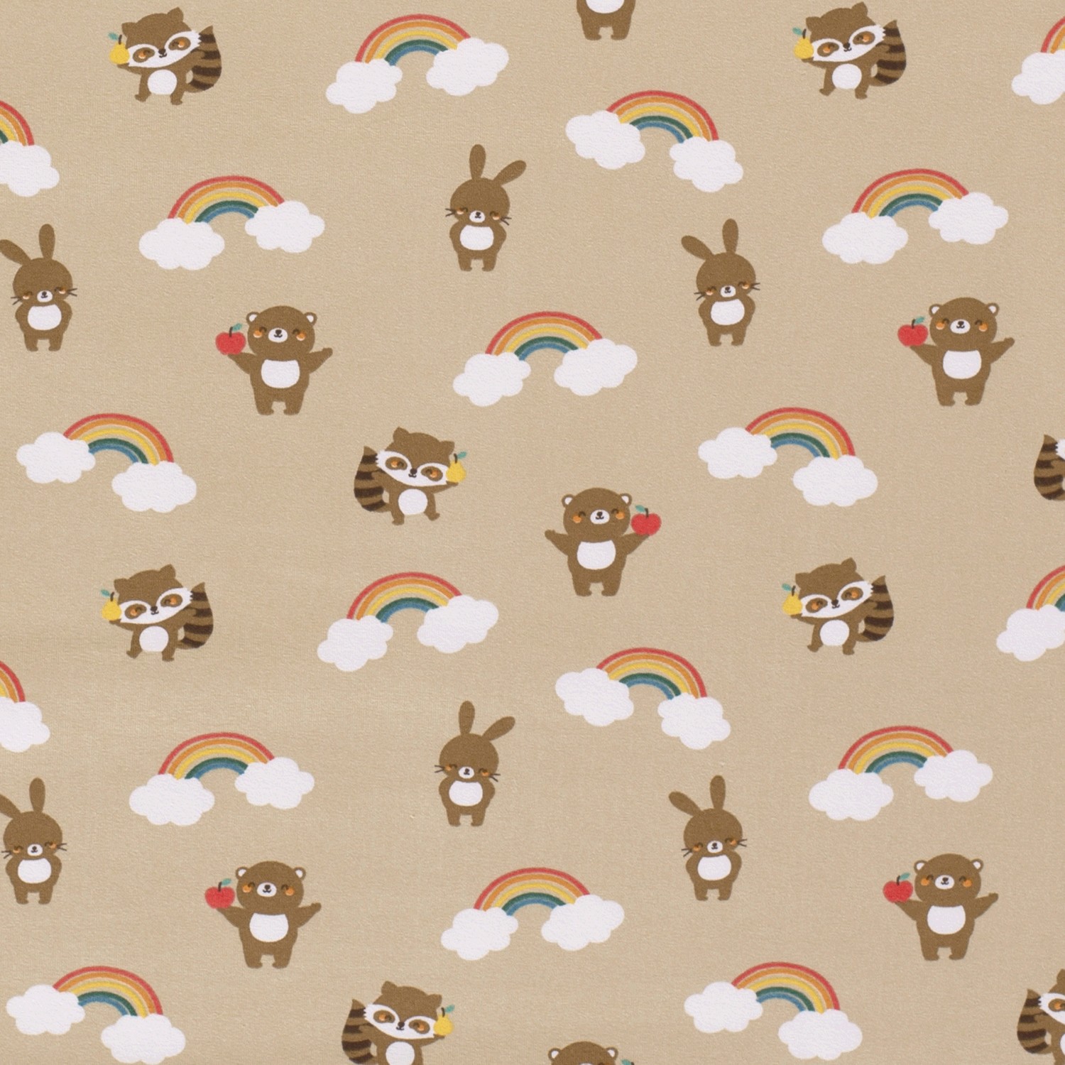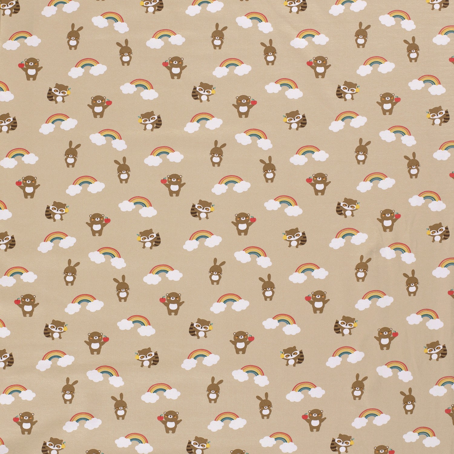 Een zachte beige tint vormt het decor voor een schattig bosavontuur: speelse konijntjes, kleine beertjes en nieuwsgierige wasberen dartelen tussen kleurrijke regenbogen, pluizige wolkjes en vrolijk fruit zoals appels en peren. De warme natuurtinten worden aangevuld met zachte roze-, gele- en bruintinten en zorgen voor een harmonieuze, liefdevolle uitstraling.