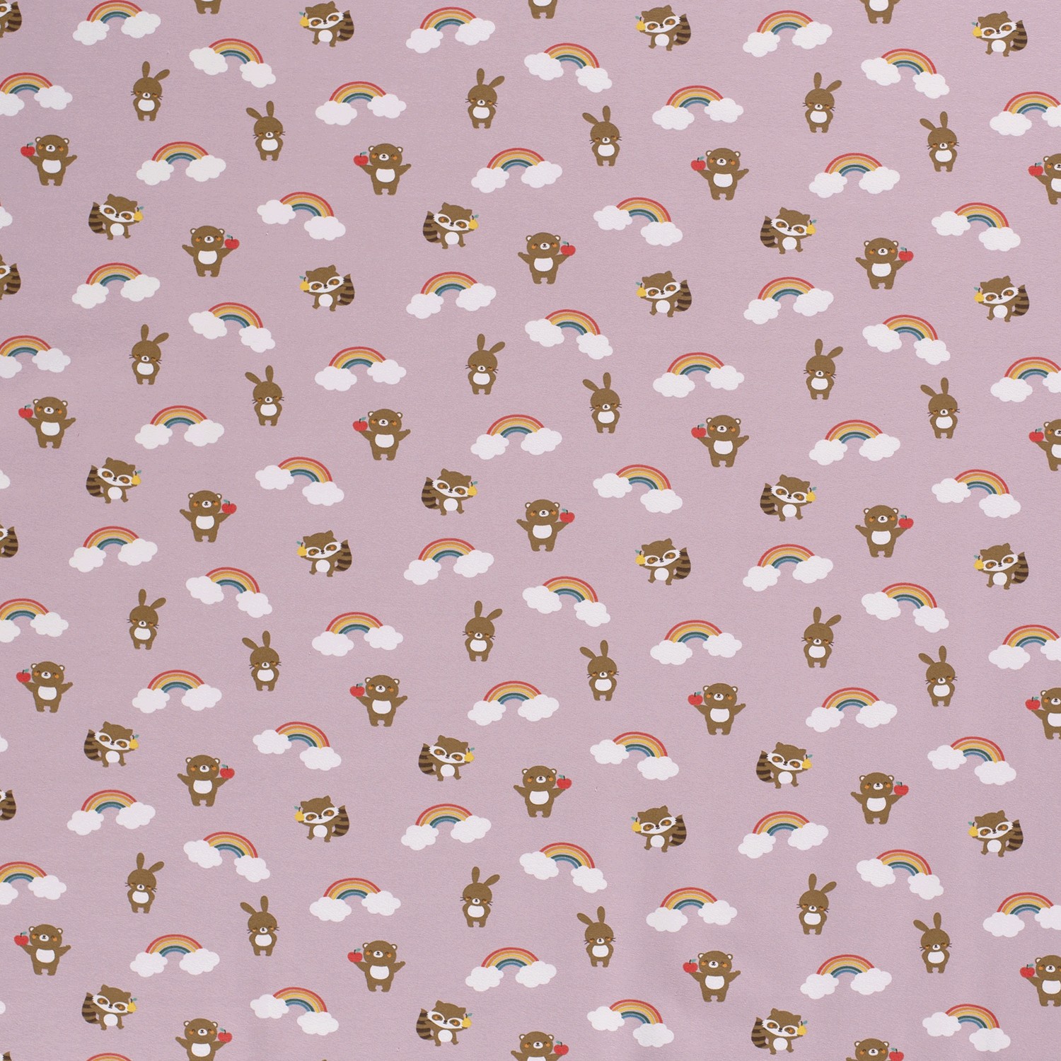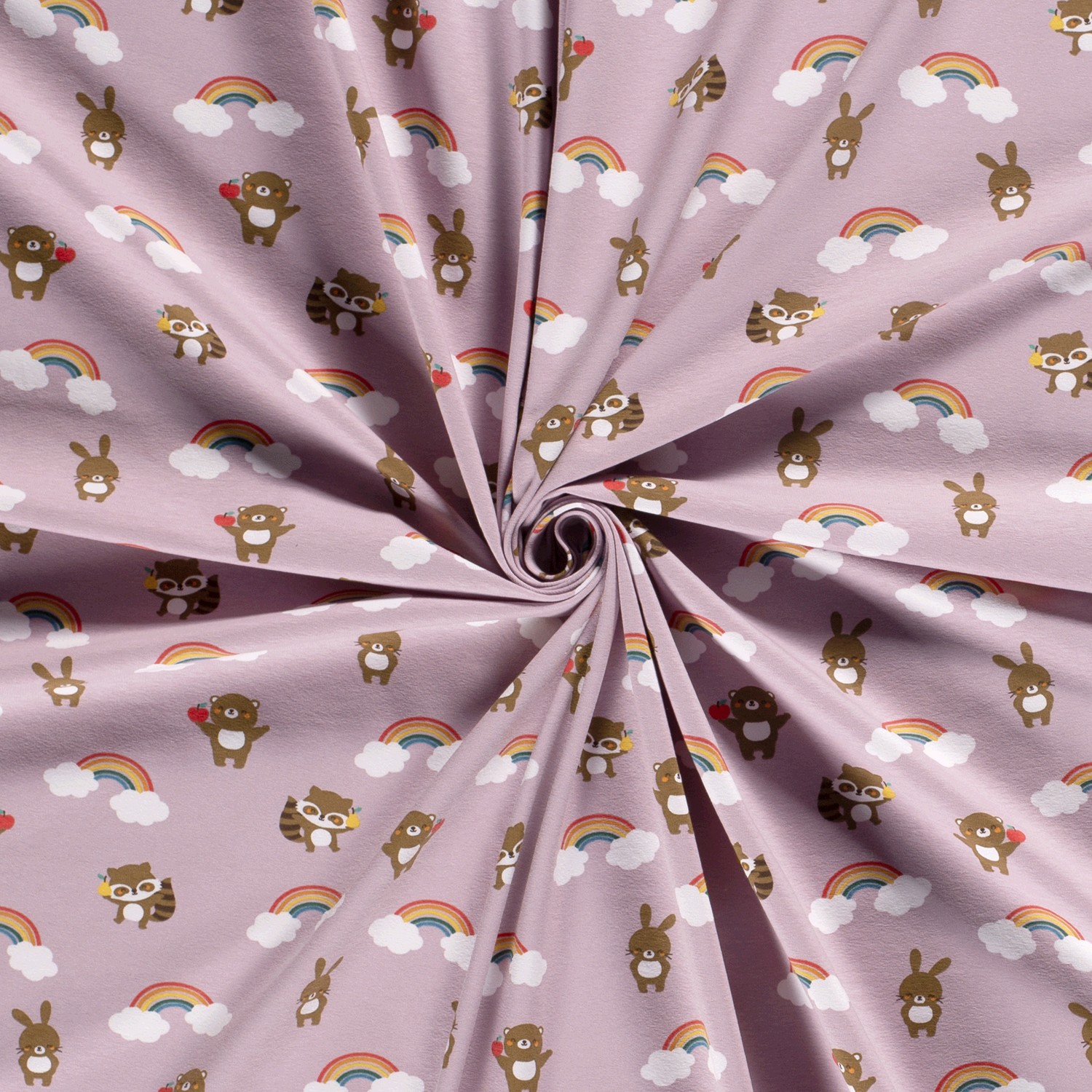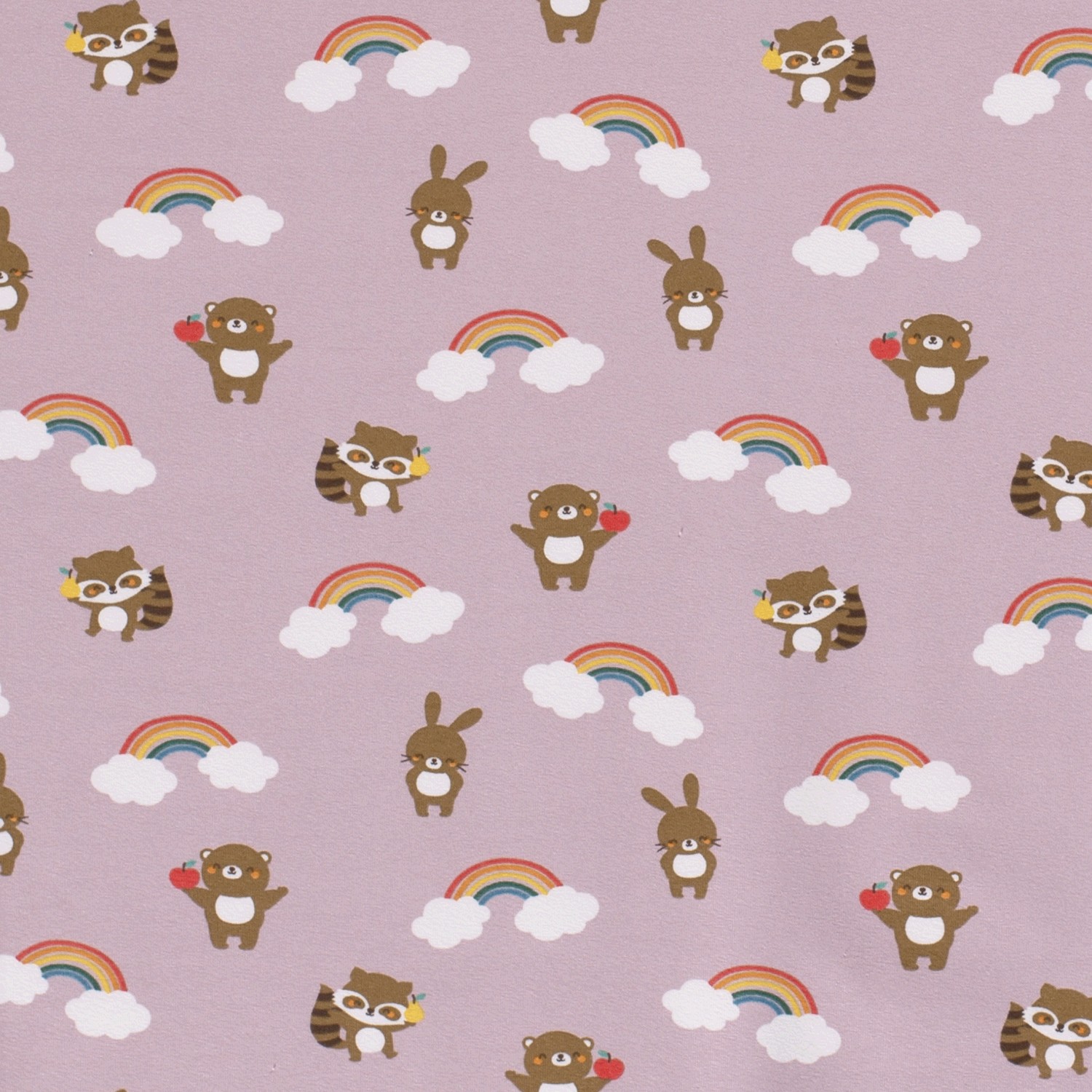 Een zachte oudroze tint ontmoet een lief bosontwerp: Op deze jersey dartelen schattige konijntjes, kleine beertjes en brutale wasberen tussen kleurrijke regenbogen, wolken en mooie vruchten zoals appels en peren. Het zachte kleurenpalet van oudroze, warme bruin- en crèmetinten, zacht grijs en fijne pasteltinten straalt harmonie en vrolijkheid uit – perfect voor kleine en grote favoriete stukken.