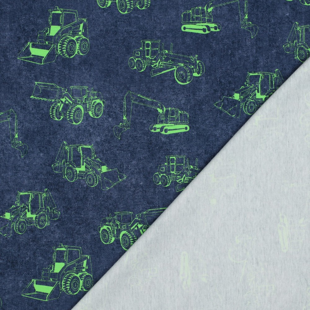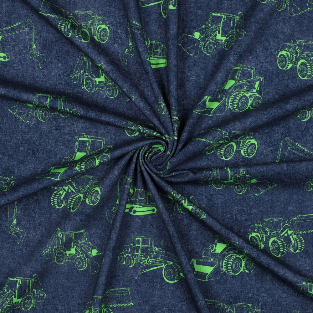 Hier komt actie op de stoftafel: Op een diepblauwe achtergrond rijden felle bouwvoertuigen in neon-look over de jersey. Felgele en oranje graafmachines, kiepwagens en kranen zorgen voor sterke contrasten en maken het ontwerp een echte blikvanger – perfect voor kleine bouwfans.