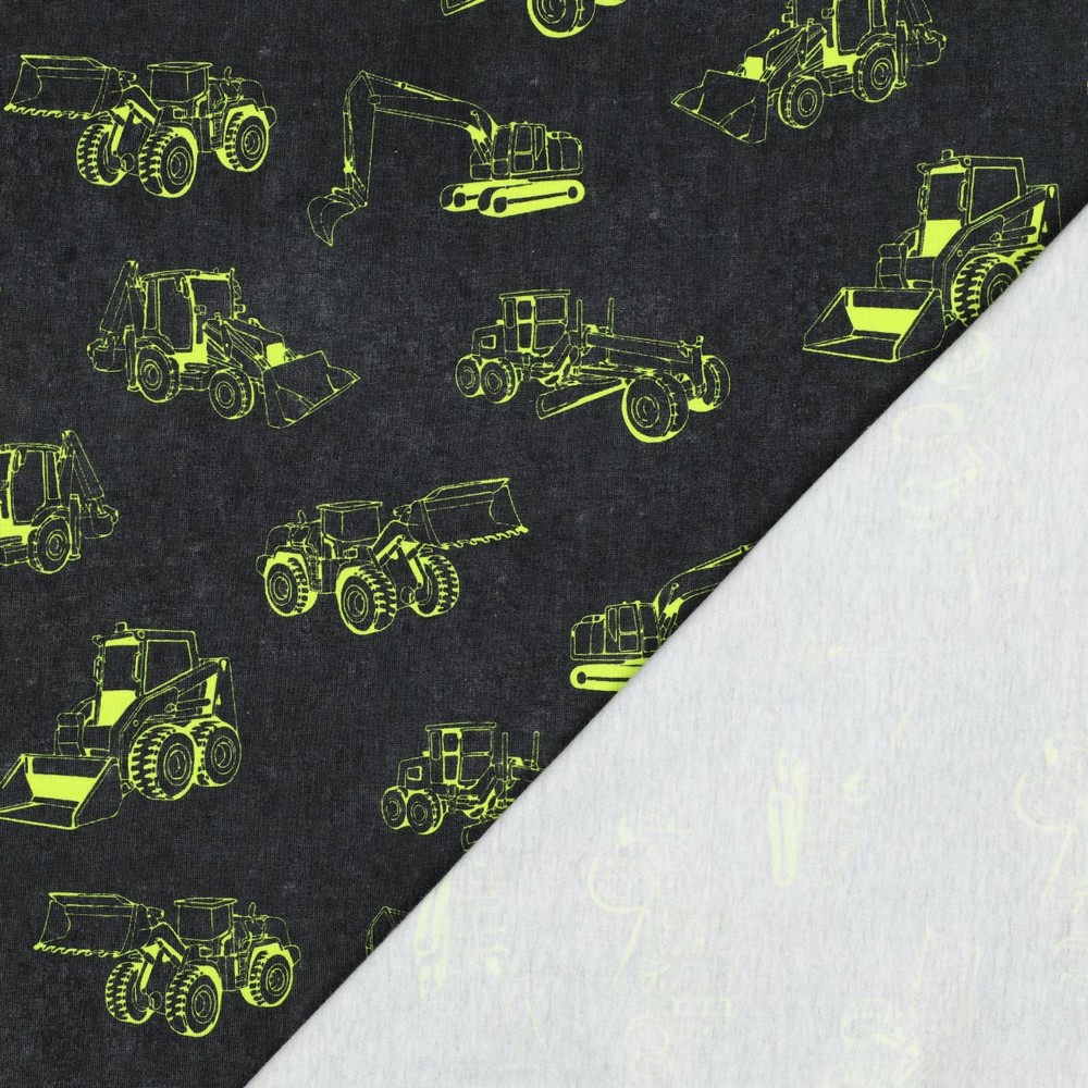 De contrastrijke print maakt de stof tot een absolute blikvanger – perfect voor kleine en grote bouwliefhebbers die houden van opvallend en bijzonder. Of het nu comfortabele shirts, hoodies, joggingbroeken, leggings, jurken of nachtmode zijn: met deze jersey ontstaan favoriete kledingstukken die zeker niet over het hoofd worden gezien. Ideaal voor iedereen die van bouwvoertuigen houdt en een coole streetwear-stijl met neon-effect wil.