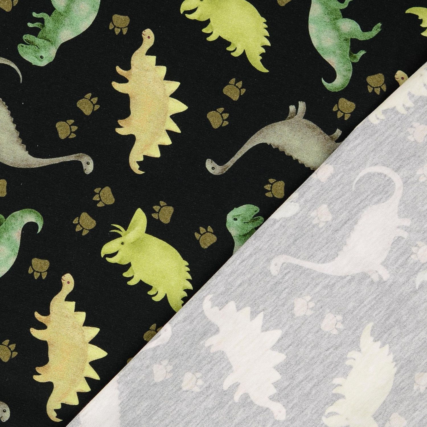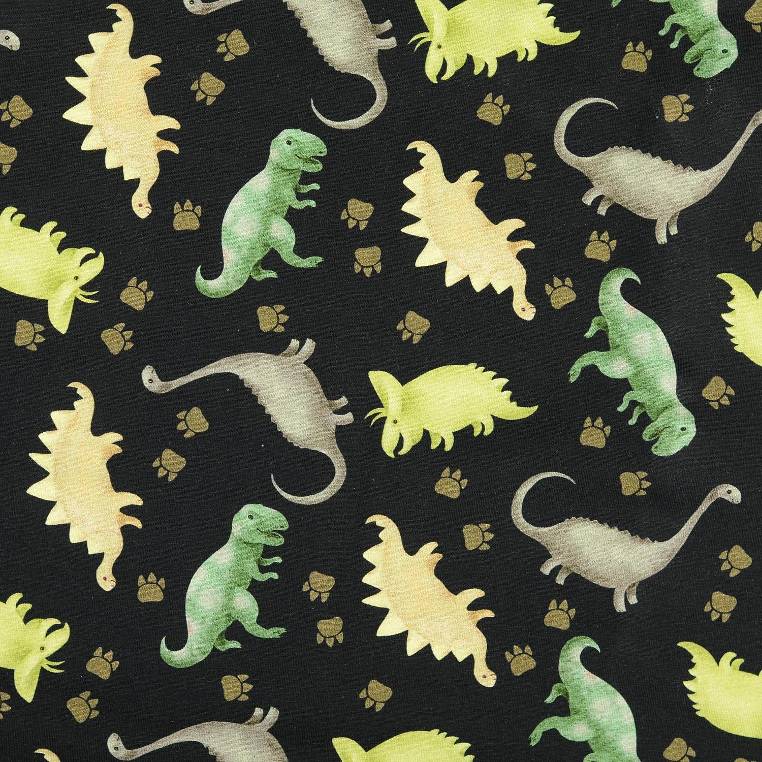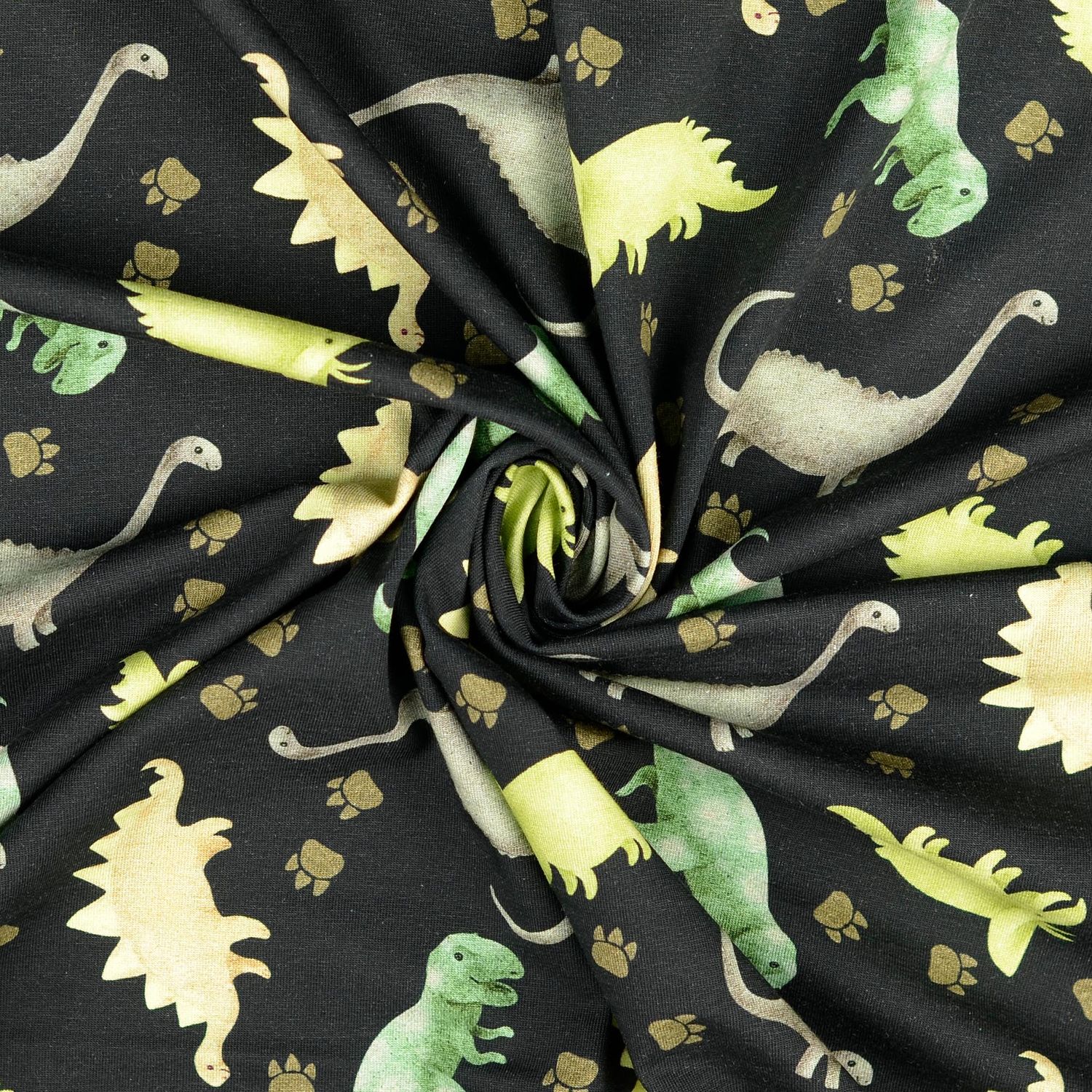 Een stof als een uitstapje naar de oertijd: Op een diepzwarte achtergrond bewegen zich gedetailleerd getekende dinosaurussen in krachtige groene en gele tinten. Tussen T-Rex, Triceratops & Co zorgen kleine plantenmotieven en schaduweffecten voor een levendige, bijna driedimensionale uitstraling.