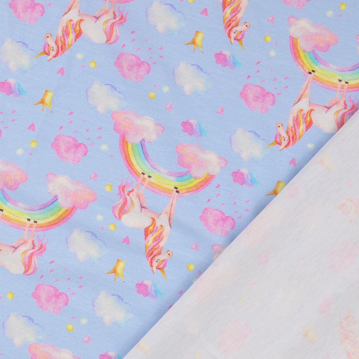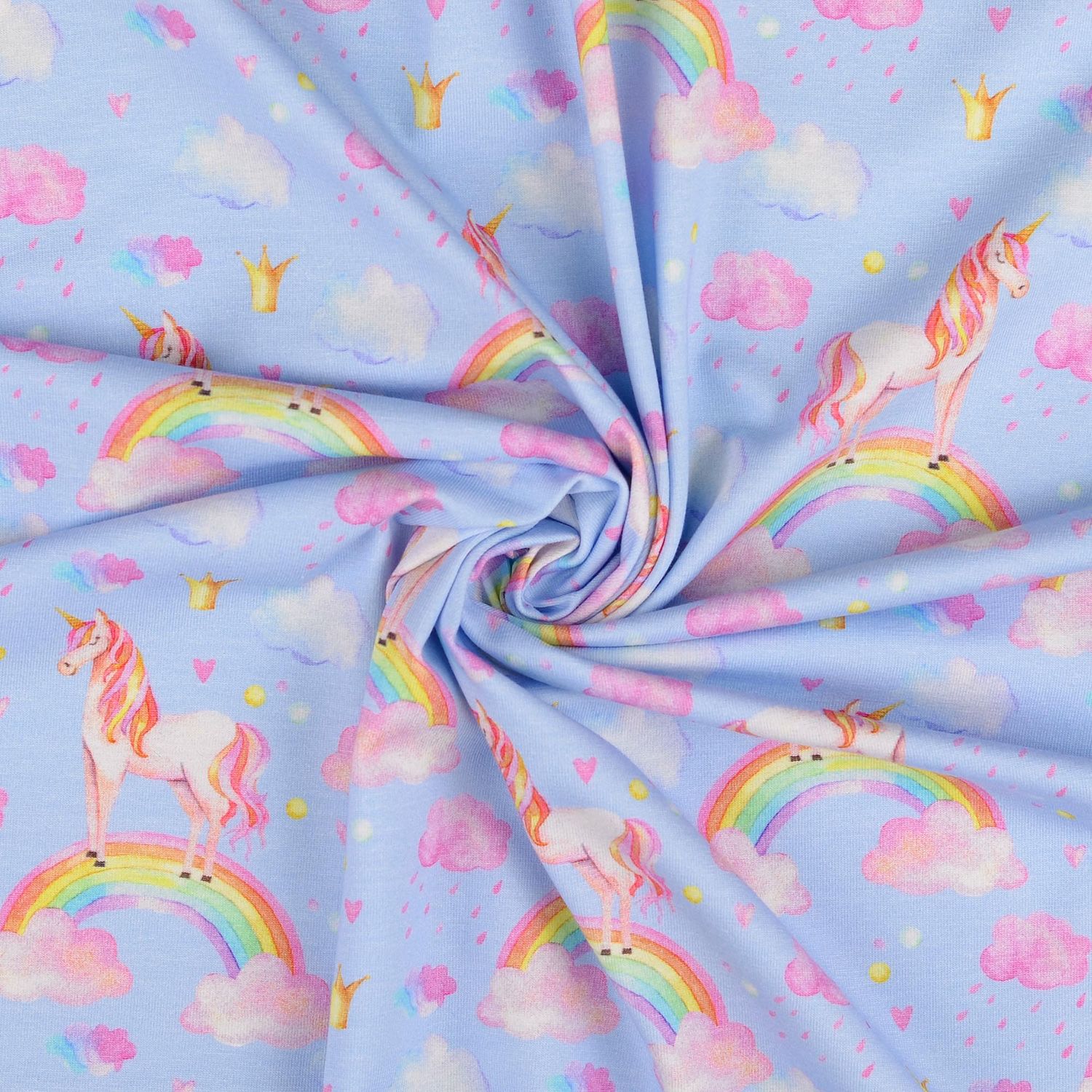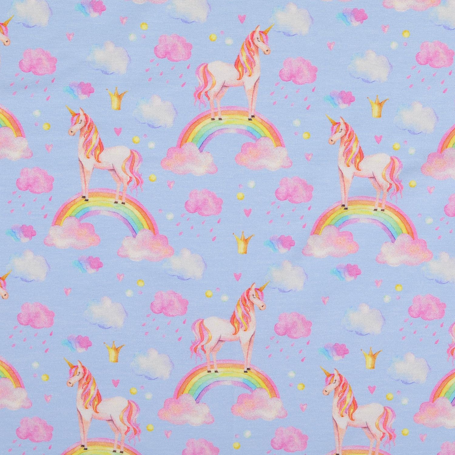 Een stof als uit een droom: op een zacht lichtblauwe achtergrond galopperen betoverende eenhoorns door een kleurrijke sprookjeswereld. Zachte pasteltinten ontmoeten stralende regenbogen, kleine sterretjes en speelse details die meteen voor een vrolijke sfeer zorgen.