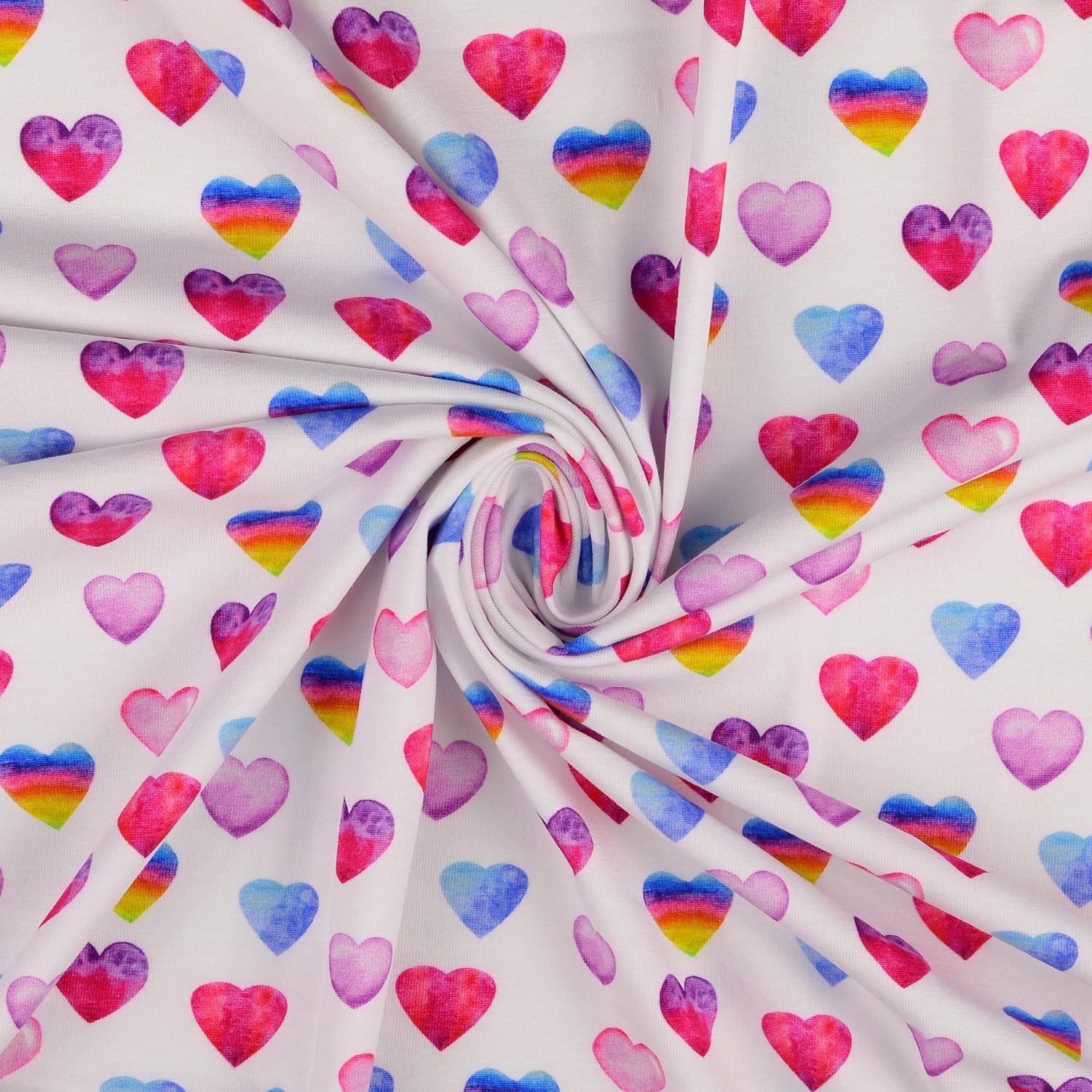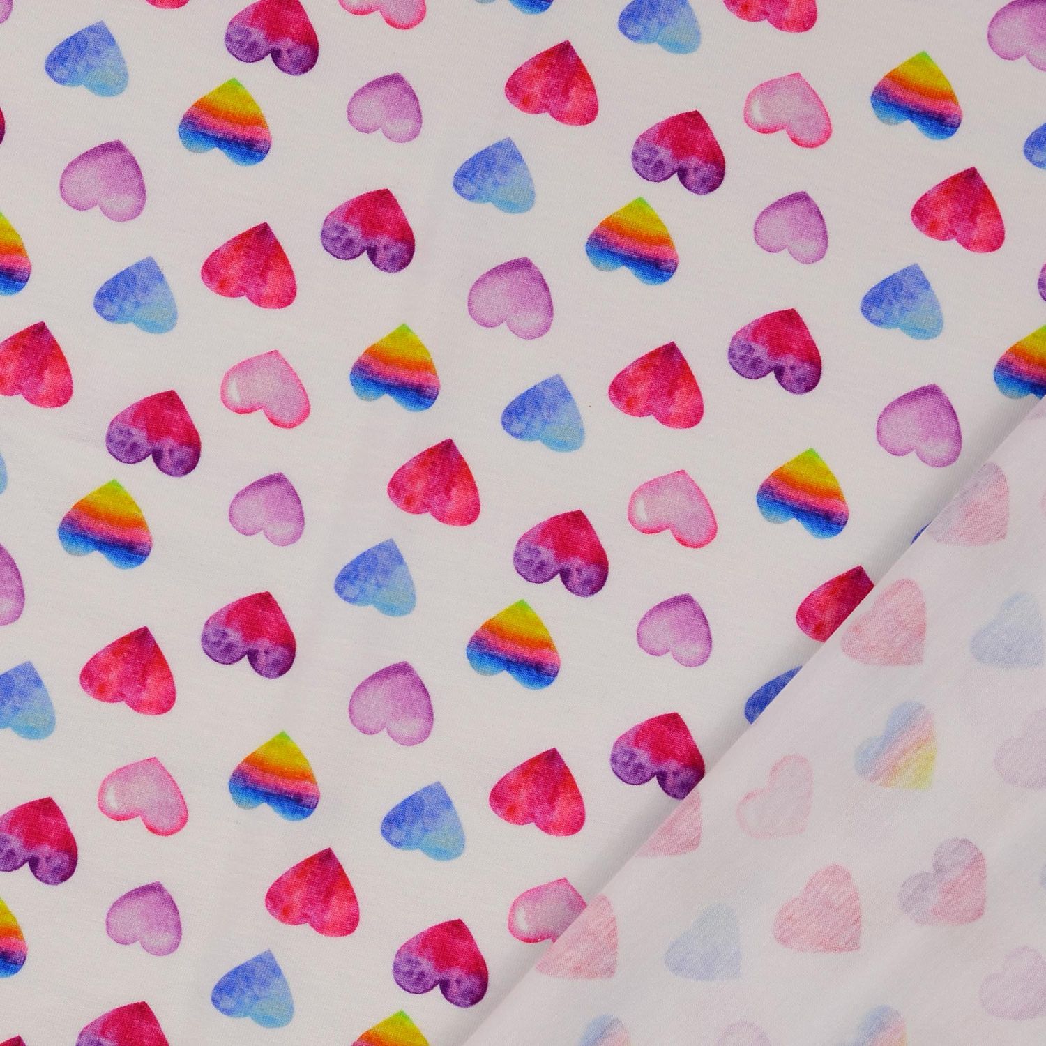 Een stof om verliefd op te worden: Op een stralend witte achtergrond dansen talloze kleurrijke hartjes – soms kleiner, soms groter, dicht op elkaar verdeeld. Het vrolijke kleurenpalet loopt van zacht roze en felroze tot zonnig geel en fris turkoois, tot diepe blauw- en paarstinten. Zo ontstaat een levendig, speels patroon dat meteen vrolijk maakt.