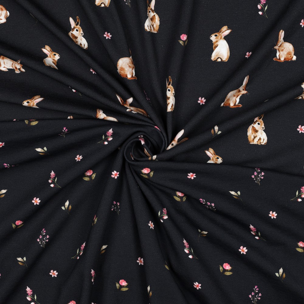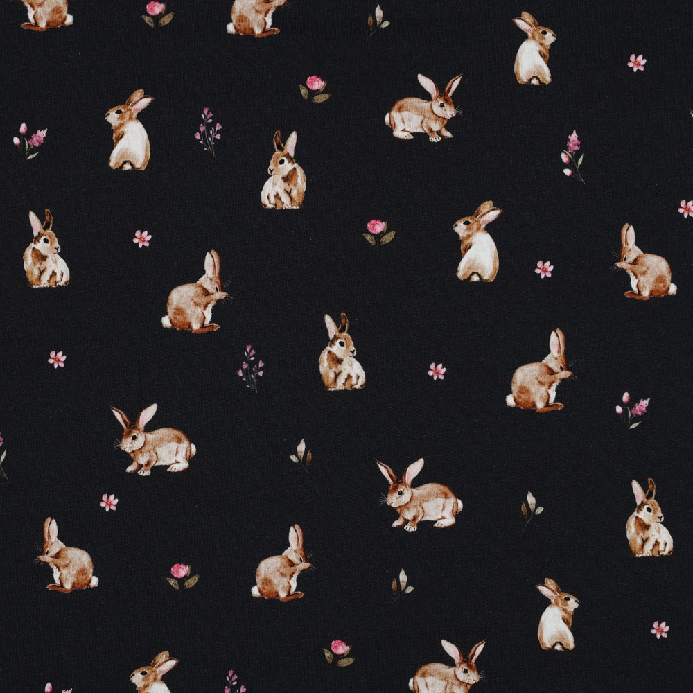 Een schattige combistof voor kleine en grote konijnenfans: liefelijk geïllustreerde konijntjes dartelen op een diep navyblauwe achtergrond, vergezeld door delicate bladeren en fijne details in zachte natuurtinten. Het harmonieuze kleurenpalet van donkerblauw, crème, beige en subtiele accenten maakt deze jersey de perfecte partner voor veel ontwerpen – of het nu als combinatiestof bij een paneel, bij motiefstoffen of als blikvanger op zichzelf is.