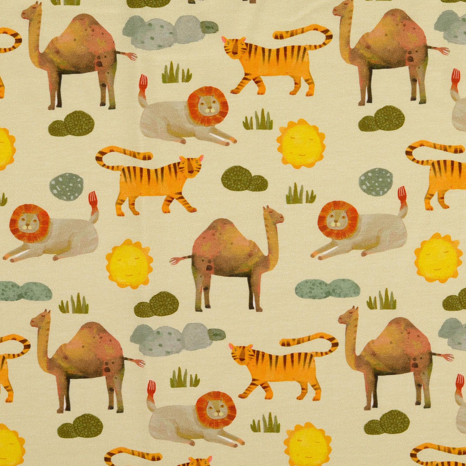 Of het nu een schattig rompertje, comfortabele legging, speels jurkje of kussenhoes is: deze safari jersey brengt avontuurlijkheid, warmte en veel vrolijkheid in elk naai-project.