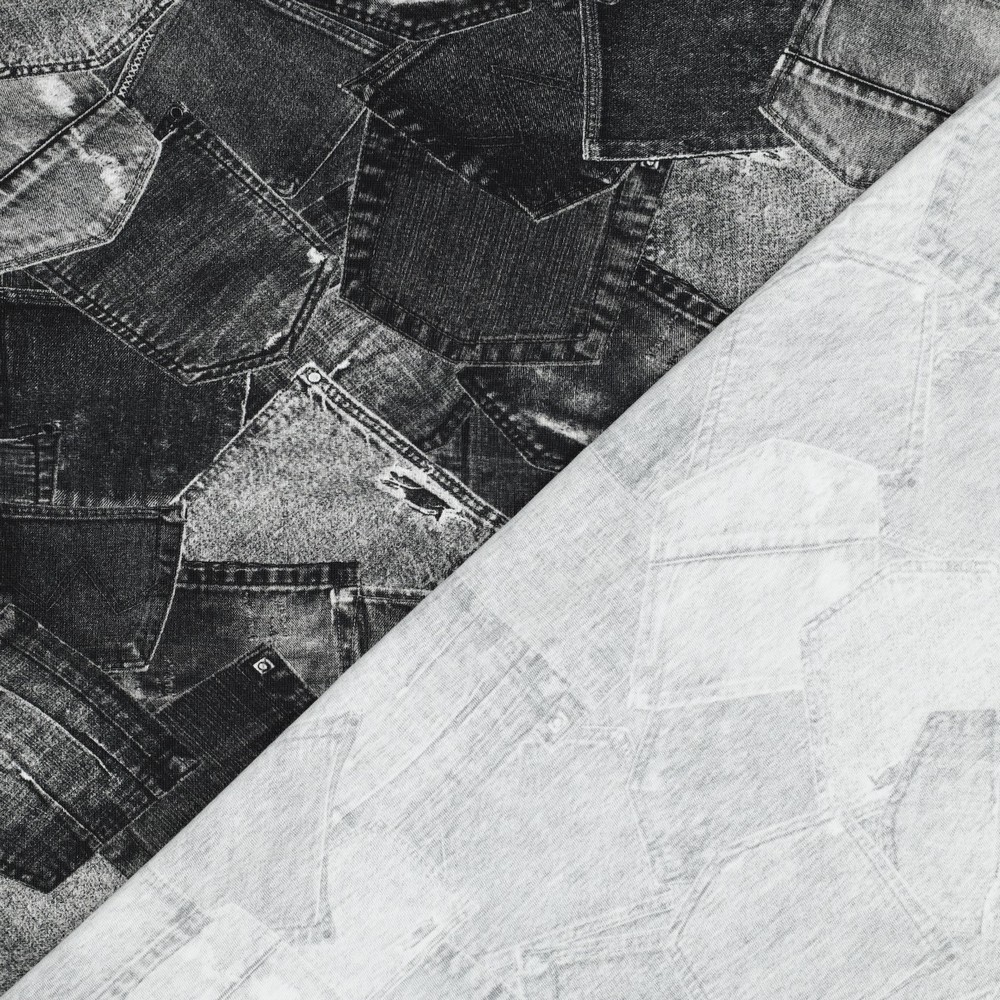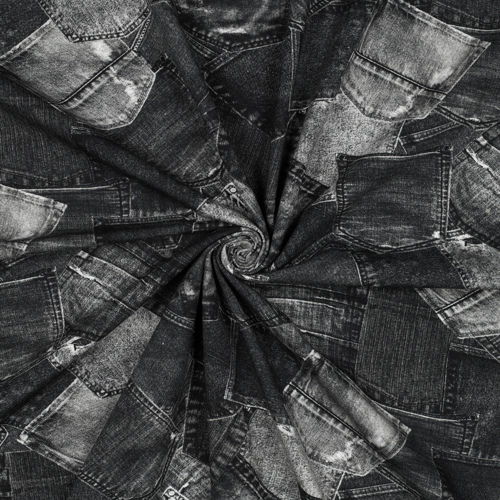 Deze jersey brengt de casual denim-look rechtstreeks naar je naaitafel – zonder stijf spijkerstof. De gedetailleerde digitale print toont realistisch ogende zwarte spijkerbroeken met duidelijke zakken, naden en typische denim-schaduwen.