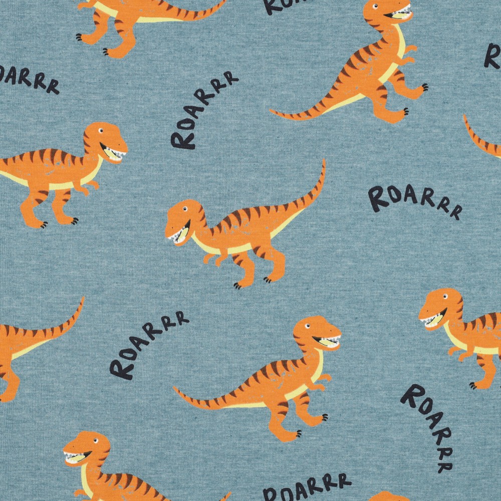 Een stof als een avontuur in dinoland: Op een gemêleerde petrol achtergrond dartelen vrolijke dinosaurussen in frisse groentinten, zacht beige en warm oranje. Speelse details zoals kleine blaadjes en stippen maken het ontwerp levendig zonder te wild te zijn – perfect voor kleine dino-fans.