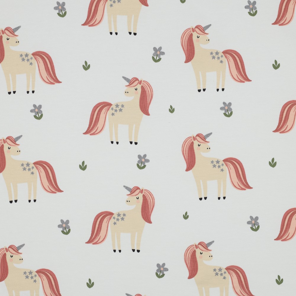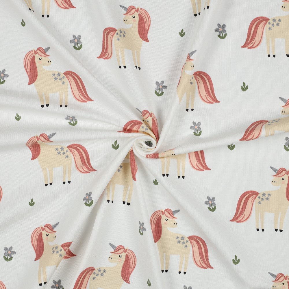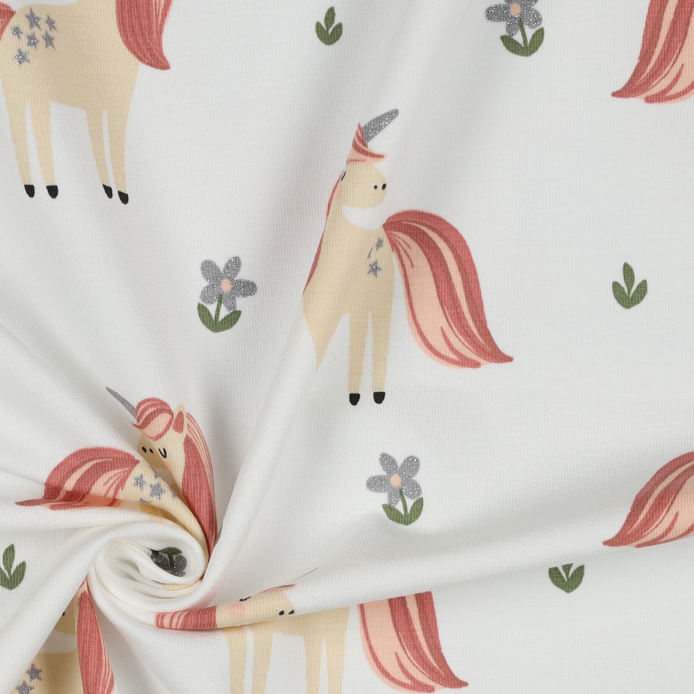 Een stof rechtstreeks uit een sprookjesboek: betoverende eenhoorns dartelen op een helderwitte achtergrond, versierd met sprankelende glitterdetails. Fijne, garengeverfde strepen geven het ontwerp een elegante, licht gestructureerde look en zorgen ervoor dat de stof er bijzonder hoogwaardig uitziet.
