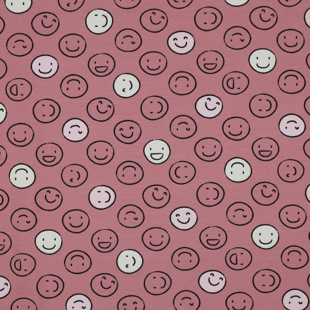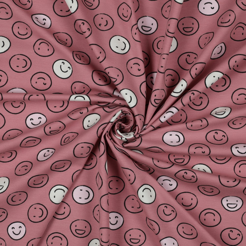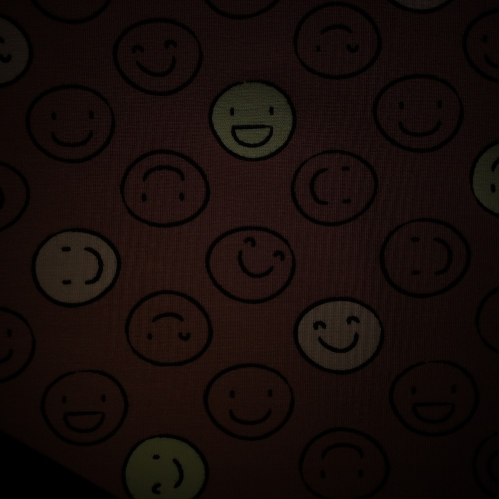 Deze vrolijke jersey tovert gegarandeerd een glimlach op je gezicht – zelfs in het donker! Op een zachte oudroze achtergrond dartelen kleine, gloeiende smileys die in het licht subtiel speels zijn en in het donker hun speciale glow-effect laten zien.
