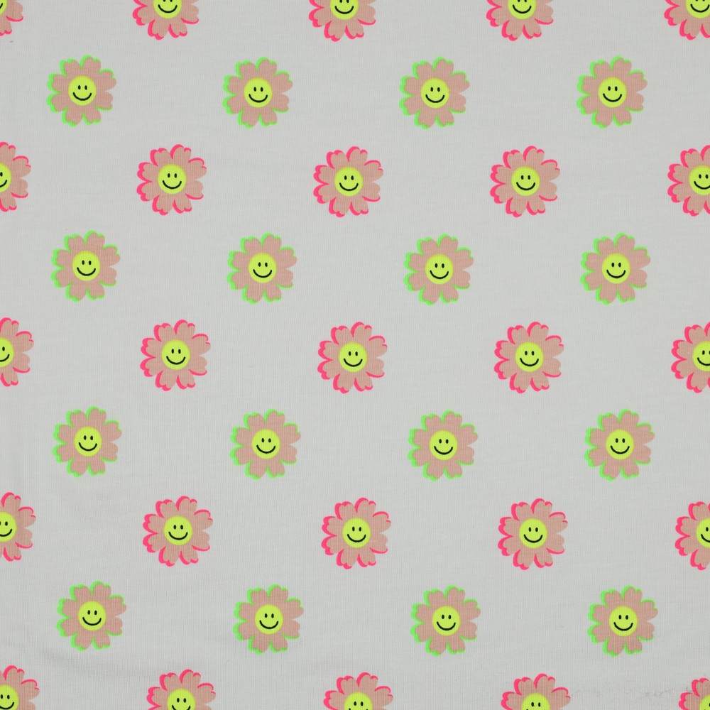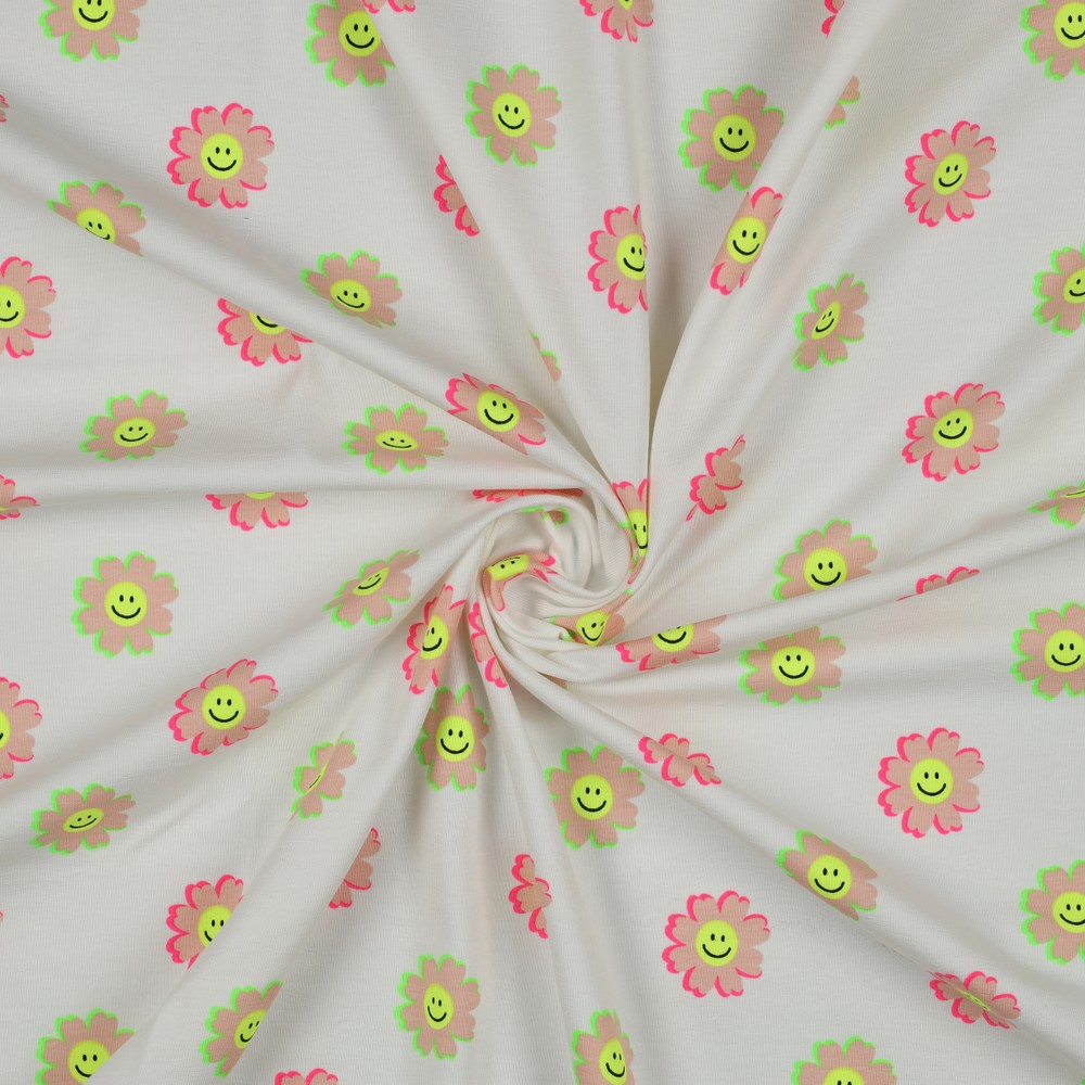 Deze vrolijke jersey brengt kleur in elk naai-project: op een stralend witte achtergrond dartelen kleine, grappige bloemetjes in felle neonkleuren. Knallend roze, krachtig oranje, intens geel, fris groen en stralend blauw zorgen voor een frisse, moderne uitstraling die direct in het oog springt.